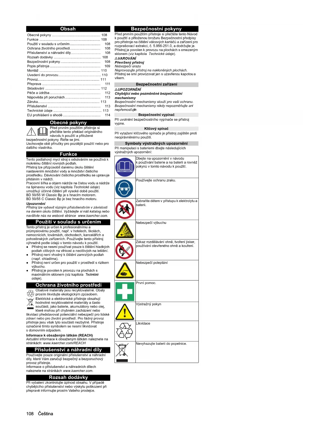 dB(A) 84,1 84,1 BD 50/55 W Classic Bp BD 50/55 C Classic Bp Chairman of the Board of Management Director Regulatory Affairs & Certification H. Jenner S. Reiser108 Čeština Obsah Obecné pokyny Před prvním použitím přístroje si přečtěte tento překlad originálního návodu k použití a přiložené bezpečnostní pokyny. Řiďte se jimi. Uschovejte obě příručky pro pozdější použití nebo pro dalšího vlastníka. Funkce Tento podlahový mycí stroj s odsáváním se používá k mokrému čištění rovných podlah. Přístroj lze přizpůsobit danému úkolu čištění nastavením množství vody a množství čisticího prostředku. Dávkování čisticího prostředku se upravuje přidáním v nádrži. Pracovní šířka a objem nádrže na čistou vodu a nádrže na špinavou vodu (viz kapitola Technické údaje) umožňují účinné čištění při vysoké době použití. BD 50/55 W Classic Bp je s hnacím motorem. BD 50/55 C Classic Bp je bez hnacího motoru. Upozornění Přístroj lze vybavit různým příslušenstvím v závislosti na daném úkolu čištění. Vyžádejte si náš katalog nebo navštivte nás na webové stránce www.kaercher.com. Použití v souladu s určením Tento přístroj je určen k profesionálnímu a průmyslovému použití, např. v hotelech, školách, nemocnicích, továrnách, obchodech, kancelářích a pohostinských zařízeních. Používejte tento přístroj výhradně podle údajů v tomto návodu k použití. ● Přístroj se nesmí používat pouze k čištění hladkých podlah citlivých na vlhkost a necitlivých na leštění. ● Přístroj není vhodný k čištění zamrzlých pod lah