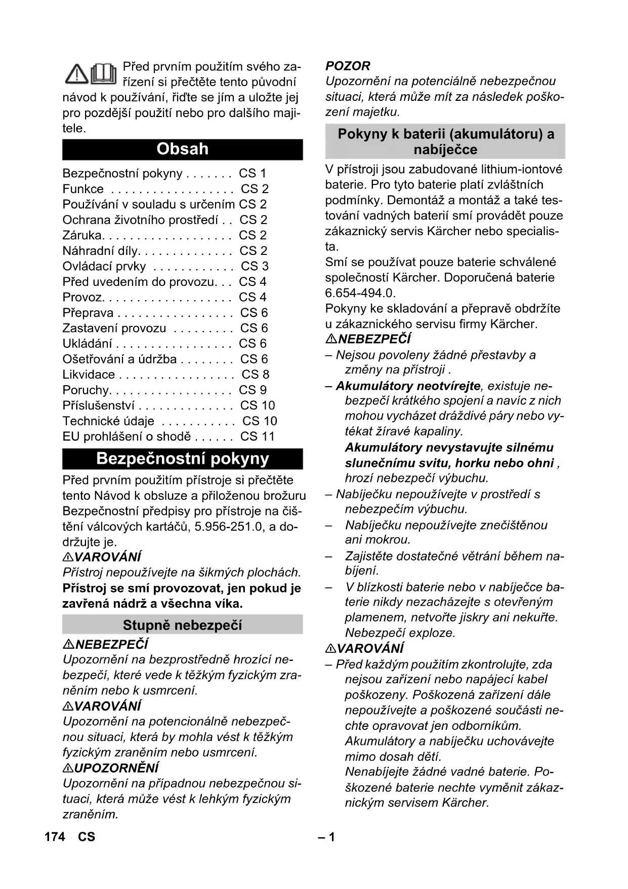 dB(A) 85 EU konformitási nyiltakozat Termék: Súroló-szívó gép Típus: 1.783-xxx Vonatkozó európai közösségi irányel- vek: 2006/42/EK (+2009/127/EK) 2014/30/EU 2011/65/EU 2014/53/EU (TCU) Alkalmazott harmonizált szabványok: EN 60335–1 EN 60335–2–72 EN 60335-2-29 EN 55012: 2007 + A1: 2009 EN 55014-1:2006 + A1: 2009 + A2:2011 EN 55014–2: 1997 + A1: 2001 + A2: 2008 EN 61000–3–2: 2014 EN 61000–3–3: 2013 EN 61000–6–2: 2005 EN 62233: 2008 EN IEC 63000: 2018 Alkalmazott összehangolt normák: TCU EN 301 511 V12.5.1 EN 300 440 V2.1.1 EN 300 328 V2.2.2 EN 300 330 V2.1.1 Chairman of the Board of Management Director Regulatory Affairs & Certification 173HU– 1 Před prvním použitím svého za- řízení si přečtěte tento původní návod k používání, řiďte se jím a uložte jej pro pozdější použití nebo pro dalšího maji- tele. Před prvním použitím přístroje si přečtěte tento Návod k obsluze a přiloženou brožuru Bezpečnostní předpisy pro přístroje na čiš- tění válcových kartáčů, 5.956-251.0, a do- držujte je. 몇 VAROVÁNÍ Přístroj nepoužívejte na šikmých plochách. Přístroj se smí provozovat, jen pokud je zavřená nádrž a všechna víka. NEBEZPEČÍ Upozornění na bezprostředně hrozící ne- bezpečí, které vede k těžkým fyzickým zra- něním nebo k usmrcení. 몇 VAROVÁNÍ Upozornění na potencionálně nebezpeč- nou situaci, která by mohla vést k těžkým fyzickým zraněním nebo usmrcení. 몇 UPOZORNĚNÍ Upozornění na případnou nebezpečnou si- tuaci, která může vést k lehkým fyzickým zraněním. POZOR Upozornění na potenciálně nebezpečnou situaci, která může mít za následek poško- zení majetku. V přístroji jsou zabudované lithium-iontové baterie. Pro tyto baterie platí zvláštních podmínky. Demontáž a montáž a také tes- tování vadných baterií smí provádět pouze zákaznický servis Kärcher nebo specialis- ta. Smí se používat pouze baterie schválené společností Kärcher. Doporučená baterie 6.654-494.0. Pokyny ke skladování a přepravě obdržíte u zákaznického servisu firmy Kärcher. NEBEZPEČÍ – Nejsou povoleny žádné přestavby a změny na přístroji . – Akumulátory neotvírejte, existuje ne- bezpečí krátkého spojení a navíc z nich mohou vycházet dráždivé páry nebo vy- tékat žíravé kapaliny. Akumulátory nevystavujte silnému slunečnímu svitu, horku nebo ohni , hrozí nebezpečí výbuchu. – Nabíječku nepoužívejte v prostředí s nebezpečím výbuchu. – Nabíječku nepoužívejte znečištěnou ani mokrou. – Zajistěte dostatečné větrání během na- bíjení. – V blízkosti baterie nebo v nabíječce ba- terie nikdy nezacházejte s otevřeným plamenem, netvořte jiskry ani nekuřte. Nebezpečí exploze. 몇 VAROVÁNÍ – Před každým použitím zkontrolujte, zda nejsou zařízení nebo napájecí kabel poškozeny. Poškozená zařízení dále nepoužívejte a poškozené součásti ne- chte opravovat jen odborníkům. Akumulátory a nabíječku uchovávejte mimo dosah dětí. Nenabíjejte žádné vadné baterie. Po- škozené baterie nechte vyměnit zákaz- nickým servisem Kärcher. Obsah Bezpečnostní pokyny . . . . . . . CS 1 Funkce . . . . . . . . . . . . . . . . . . CS 2 Používání v souladu s určením CS 2 Ochrana životního prostředí . . CS 2 Záruka. . . . . . . . . . . . . . . . . . . CS 2 Náhradní díly. . . . . . . . . . . . . . CS 2 Ovládací prvky . . . . . . . . . . . . CS 3 Před uvedením do provozu. . . CS 4 Provoz. . . . . . . . . . . . . . . . . . . CS 4 Přeprava . . . . . . . . . . . . . . . . . CS 6 Zastavení provozu . . . . . . . . . CS 6 Ukládání . . . . . . . . . . . . . . . . . CS 6 Ošetřování a údržba . . . . . . . . CS 6 Likvidace . . . . . . . . . . . . . . . . . CS 8 Poruchy. . . . . . . . . . . . . . . . . . CS 9 Příslušenství . . . . . . . . . . . . . . CS 10 Technické údaje . . . . . . . . . . . CS 10 EU prohlášení o shodě . . . . . . CS 11 Bezpečnostní pokyny Stupně nebezpečí Pokyny k baterii (akumulátoru) a nabíječce 174 CS– 2 – Nevyhazujte poškozené baterie do do- movního odpadu, informujte zákaznic- ký servis Kärcher. – Zamezte styk s tekutinou vytékající z poškozených akumulátorů. Při náhod- ném styku s touto tekutinou příslušné místo opláchněte vodou. Při zasažení očí ještě vyhledejte lékařskou pomoc. 몇 UPOZORNĚNÍ – Je nezbytné dodržovat tento provozní návod. Postupujte podle doporučení zákonodárce při nakládání s bateriemi. – Napětí sítě musí odpovídat napětí uvede- nému na identifikačním štítku přístroje. – Nabíječku používejte pouze k nabíjení schválených akumulátorů. – Akumulátor by měl být provozován pou- ze s tímto přístrojem, je zakázáno a ne- bezpečné používat jej k jiným účelům. Pokud je uvolněn bezpečnostní spínač, vy- pne se pohon kartáčů. Podlahový mycí stroj s odsáváním se pou- žívá na mokré čištění rovných podlah. Nastavením množství vody lze přístroj snadno přizpůsobit na jakékoliv čištění. Pracovní záběr 380 mm a kapacita nádrže na čerstvou a znečištěnou vodu 12°l umož- ňují efektivní čištění při vysoké době nasa- zení. Baterii lze nabíjet nabíječkou připojenou k zásuvce s napětím 230 V. Přístroj je vhodný k použití v průmyslových i jiných velkých zařízeních, např. v hote- lech, školách, nemocnicích, v továrnách, obchodech, úřadech a půjčovnách. Přístroj používejte pouze v souladu s údaji v tomto návodu k obsluze. – Přístroj lze používat pouze k čištění hladkých podlah, které nejsou citlivé na vlhkost. – Tento přístroj je určen k použití v interi- érech. – Přístroj není vhodný k čištění zmrzlých podlah (např. v chladírnách). – Pro přístroj se smí používat