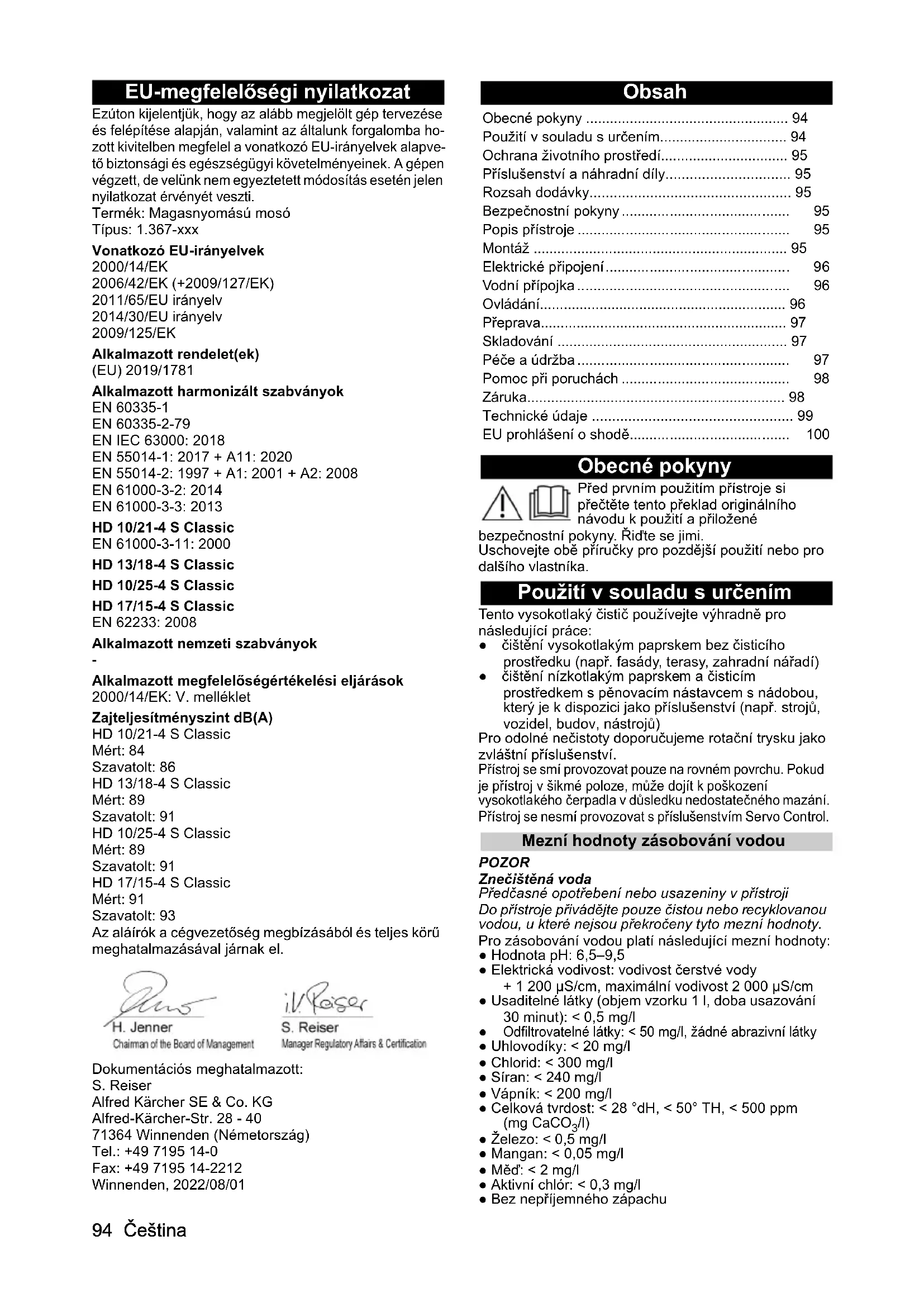 Alkalmazott megfelelőségértékelési eljárások 2000/14/EK: V. melléklet Zajteljesítményszint dB(A) HD 10/21-4 S Classic Mért: 84 Szavatolt: 86 HD 13/18-4 S Classic Mért: 89 Szavatolt: 91 HD 10/25-4 S Classic Mért: 89 Szavatolt: 91 HD 17/15-4 S Classic Mért: 91 Szavatolt: 93 Az aláírók a cégvezetőség megbízásából és teljes körű meghatalmazásával járnak el. Dokumentációs meghatalmazott: S. Reiser Alfred Kärcher SE & Co. KG Alfred-Kärcher-Str. 28 - 40 71364 Winnenden (Németország) Tel.: +49 7195 14-0 Fax: +49 7195 14-2212 Winnenden, 2022/08/01 Obsah Obecné pokyny Před prvním použitím přístroje si přečtěte tento překlad originálního návodu k použití a přiložené bezpečnostní pokyny. Řiďte se jimi. Uschovejte obě příručky pro pozdější použití nebo pro dalšího vlastníka. Použití v souladu s určením Tento vysokotlaký čistič používejte výhradně pro následující práce: ●čištění vysokotlakým paprskem bez čisticího prostředku (např. fasády, terasy, zahradní nářadí) ●čištění nízkotlakým paprskem a čisticím prostředkem s pěnovacím nástavcem s nádobou, který je k dispozici jako příslušenství (např. strojů, vozidel, budov, nástrojů) Pro odolné nečistoty doporučujeme rotační trysku jako zvláštní příslušenství. Přístroj se smí provozovat pouze na rovném povrchu. Pokud je přístroj v šikmé poloze, může dojít k poškození vysokotlakého čerpadla v důsledku nedostatečného mazání. Přístroj se nesmí provozovat s příslušenstvím Servo Control. Mezní hodnoty zásobování vodou POZOR Znečištěná voda Předčasné opotřebení nebo usazeniny v přístroji Do přístroje přivádějte pouze čistou nebo recyklovanou vodou, u které nejsou překročeny tyto mezní hodnoty. Pro zásobování vodou platí následující mezní hodnoty: ● Hodnota pH: 6,5–9,5 ● Elektrická vodivost: vodivost čerstvé vody + 1 200 µS/cm, maximální vodivost 2 000 µS/cm ● Usaditelné látky (objem vzorku 1 l, doba usazování 30 minut): < 0,5 mg/l
