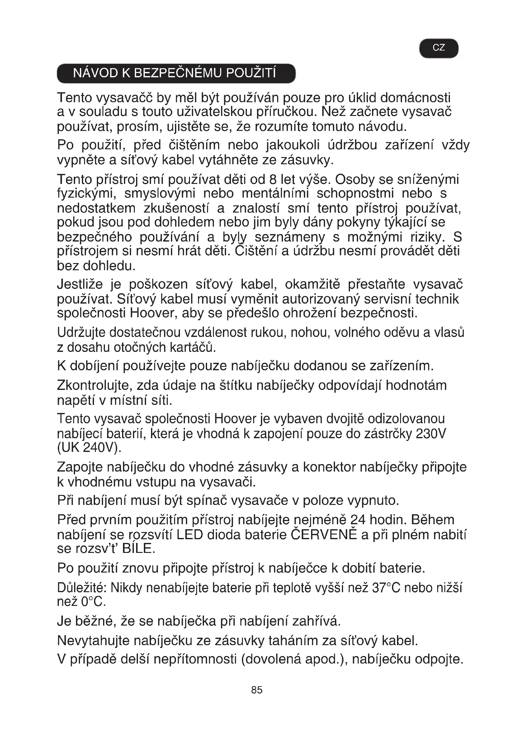 NÁVOD K BEZPEČNÉMU POUŽITÍ Tento vysavačč by měl být používán pouze pro úklid domácnosti a v souladu s touto uživatelskou příručkou. Než začnete vysavač používat, prosím, ujistěte se, že rozumíte tomuto návodu. Po použití, před čištěním nebo jakoukoli údržbou zařízení vždy vypněte a síťový kabel vytáhněte ze zásuvky. Tento přístroj smí používat děti od 8 let výše. Osoby se sníženými fyzickými, smyslovými nebo mentálními schopnostmi nebo s nedostatkem zkušeností a znalostí smí tento přístroj používat, pokud jsou pod dohledem nebo jim byly dány pokyny týkající se bezpečného používání a byly seznámeny s možnými riziky. S přístrojem si nesmí hrát děti. Čištění a údržbu nesmí provádět děti bez dohledu. Jestliže je poškozen síťový kabel, okamžitě přestaňte vysavač používat. Síťový kabel musí vyměnit autorizovaný servisní technik společnosti Hoover, aby se předešlo ohrožení bezpečnosti. Udržujte dostatečnou vzdálenost rukou, nohou, volného oděvu a vlasů z dosahu otočných kartáčů. K dobíjení používejte pouze nabíječku dodanou se zařízením. Zkontrolujte, zda údaje na štítku nabíječky odpovídají hodnotám napětí v místní síti. Tento vysavač společnosti Hoover je vybaven dvojitě odizolovanou nabíjecí baterií, která je vhodná k zapojení pouze do zástrčky 230V (UK 240V). Zapojte nabíječku do vhodné zásuvky a konektor nabíječky připojte k vhodnému vstupu na vysavači. Při nabíjení musí být spínač vysavače v poloze vypnuto. Před prvním použitím přístroj nabíjejte nejméně 24 hodin. Během nabíjení se rozsvítí LED dioda baterie ČERVENĚ a při plném nabití se rozsvítí BÍLE. Po použití znovu připojte přístroj k nabíječce k dobití baterie. Důležité: Nikdy nenabíjejte baterie při teplotě vyšší než 37°C nebo nižší než 0°C. Je běžné, že se nabíječka při nabíjení zahřívá. Nevytahujte nabíječku ze zásuvky taháním za síťový kabel. V případě delší nepřítomnosti (dovolená apod.), nabíječku odpojte. CZ86 Vysavač před použitím znovu dobijte, protože baterie se mohou při delší době skladování vybít. Před likvidací vysavače z něj nejprve vyjměte baterie. Před odstraněním baterie se ujistěte, že výrobek je odpojen od elektrické sítě. Zlikvidujte baterie bezpečně a ekologicky. Používejte zařízení dokud baterie nejsou naprosto vybité. Použité baterie by měly být přijaté do recyklační stanice a nesmějí být vyhazované dohromady s běžným odpadem. Pro vyjmutí baterií prosím kontaktujte Zákaznické servisní středisko Hoover, které najdete na internetových stránkách www.hoover.cz/cs_CZ/servisni-strediska nebo postupujte podle následujících pokynů: DŮLEŽITÉ: Před vyjmutím je nutno baterii zcela vybít. Nechte vysavač zapnutý, dokud nebudou baterie zcela vybité. Odpojte nabíječku od spotřebiče. Stiskněte tlačítko uvolnění baterie a posunutím jí vyndejte. [11] POZNÁMKA: Budete-li mít při demontáži jednotky jakékoli problémy nebo budete-li požadovat podrobnější informace o manipulaci, využití a recyklaci tohoto výrobku, kontaktujte, prosím, místní úřad nebo středisko sběrných surovin. Používejte výhradně příslušenství, spotřební materiály a náhradní díly doporučené nebo dodávané firmou Hoover. Statická elektřina: Při čištění některých koberců vzniká malé množství statické elektřiny. Výboje statické elektřiny neohrožují zdraví. Nepoužívejte Vaše zařízení venku, nebo na mokré povrchy a na mokrá vysávání. Nevysávejte tvrdé nebo ostré předměty, zápalky, žhavý popel, cigaretové nedopalky a podobné předměty. Nestříkejte nebo nevysávejte hořlavé kapaliny, čistící tekutiny, aerosoly nebo jejich výpary. Během používání vysavače nepřejíždějte přes síťový kabel a nevytahujte síťový kabel ze zásuvky taháním za něj. Nepoužívejte zařízení nebo nabíječku, pokud vám připadají vadné. Autorizované servisní středisko Hoover najdete na internetových stránkách www.bmkservis.cz/servis-candy-hoover.php: Spolehlivý provoz a vysoká účinnost tohoto spotřebiče jsou zajištěny pouze v případě, že bude prováděn pravidelný servis a opravy, které musí zajišťovat autorizovaný servisní technik společnosti Hoover. CZKOMPONENTY PRODUKTU