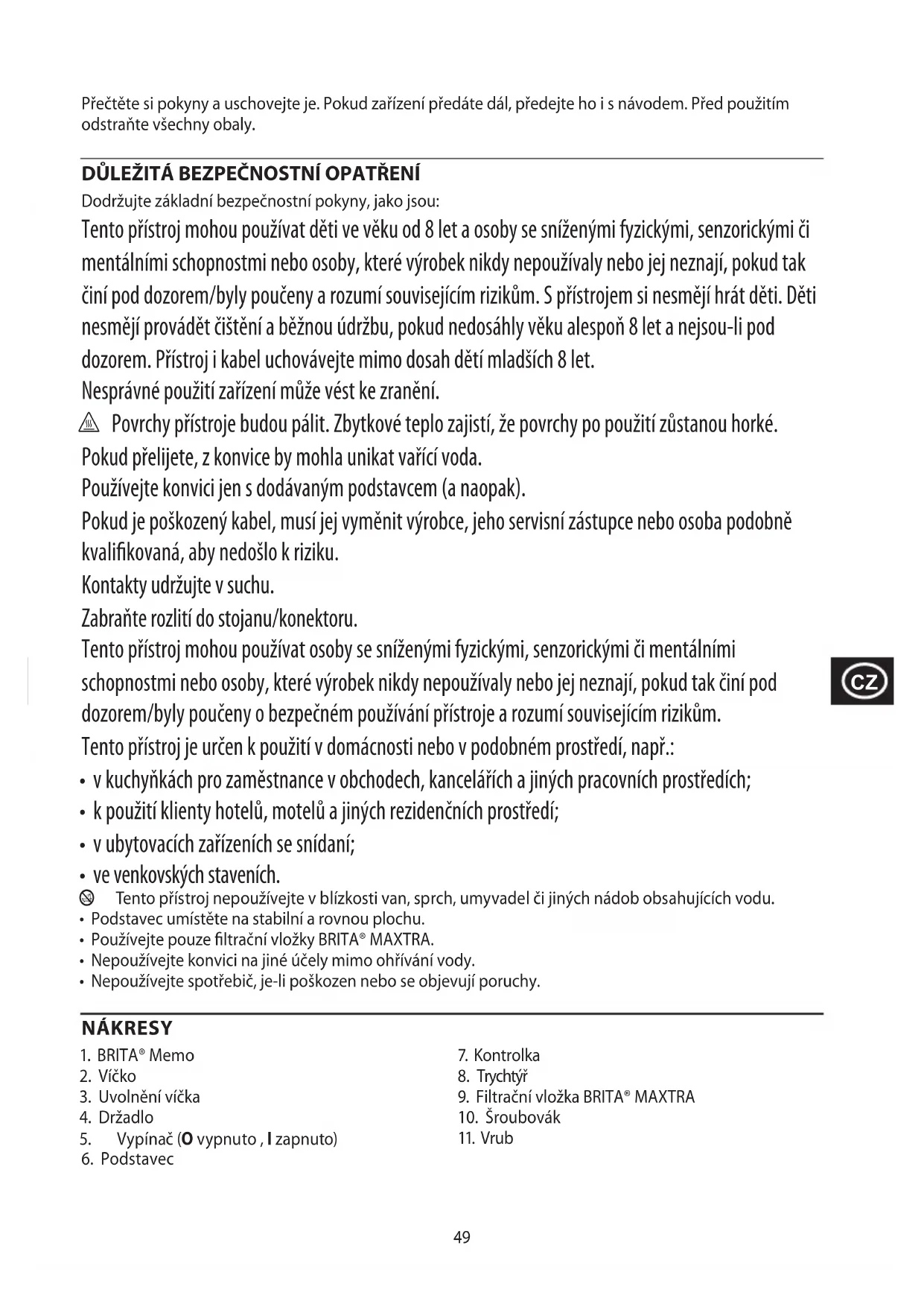 Во избежание воздействия вредных веществ на окружающую среду и здоровье приборы и батареи одноразового или многоразового использования, помеченные одним из этих символов, необходимо утилизировать отдельно от несортированных бытовых отходов. Обязательно утилизируйте электрические и электронные изделия, а также (если это применимо) батареи одноразового или многоразового использования в соответствующих официальных пунктах повторной переработки / сбора отходов.49 Přečtěte si pokyny a uschovejte je. Pokud zařízení předáte dál, předejte ho i s návodem. Před použitím odstraňte všechny obaly. DŮLEŽITÁ BEZPEČNOSTNÍ OPATŘENÍ Dodržujte základní bezpečnostní pokyny, jako jsou: Tento přístroj mohou používat děti ve věku od 8 let a osoby se sníženými fyzickými, senzorickými či mentálními schopnostmi nebo osoby, které výrobek nikdy nepoužívaly nebo jej neznají, pokud tak činí pod dozorem/byly poučeny a rozumí souvisejícím rizikům. S přístrojem si nesmějí hrát děti. Děti nesmějí provádět čištění a běžnou údržbu, pokud nedosáhly věku alespoň 8 let a nejsou-li pod dozorem. Přístroj i kabel uchovávejte mimo dosah dětí mladších 8 let. Nesprávné použití zařízení může vést ke zranění. h Povrchy přístroje budou pálit. Zbytkové teplo zajistí, že povrchy po použití zůstanou horké. Pokud přelijete, z konvice by mohla unikat vařící voda. Používejte konvici jen s dodávaným podstavcem (a naopak). Pokud je poškozený kabel, musí jej vyměnit výrobce, jeho servisní zástupce nebo osoba podobně kvalifikovaná, aby nedošlo k riziku. Kontakty udržujte v suchu. Zabraňte rozlití do stojanu/konektoru. Tento přístroj mohou používat osoby se sníženými fyzickými, senzorickými či mentálními schopnostmi nebo osoby, které výrobek nikdy nepoužívaly nebo jej neznají, pokud tak činí pod dozorem/byly poučeny o bezpečném používání přístroje a rozumí souvisejícím rizikům. Tento přístroj je určen k použití v domácnosti nebo v podobném prostředí, např.:
