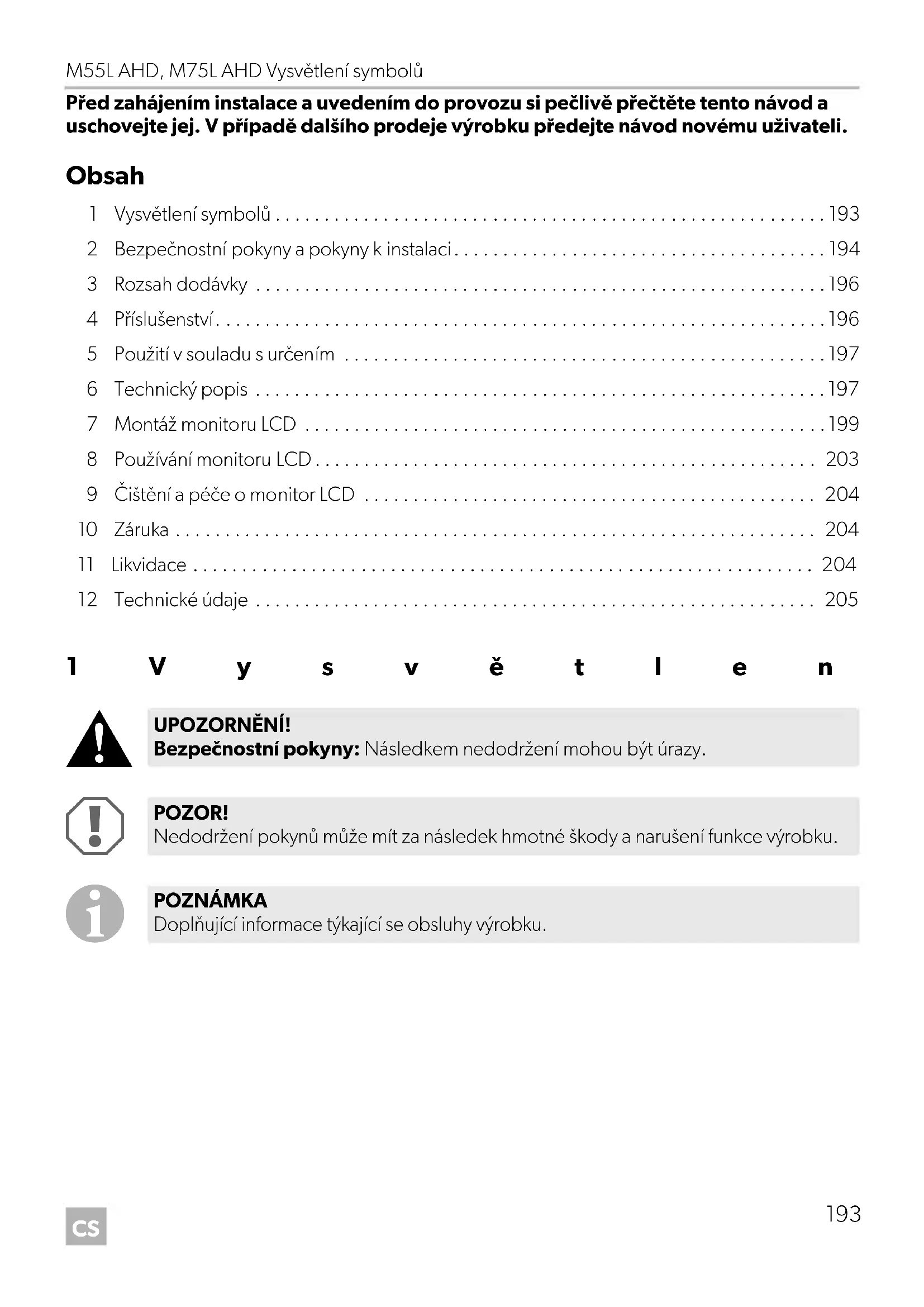 - Před zahájením instalace a uvedením do provozu si pečlivě přečtěte tento návod a uschovejte jej. V případě dalšího prodeje výrobku předejte návod novému uživateli. Obsah 1 Vysvětlení symbolů p. 193