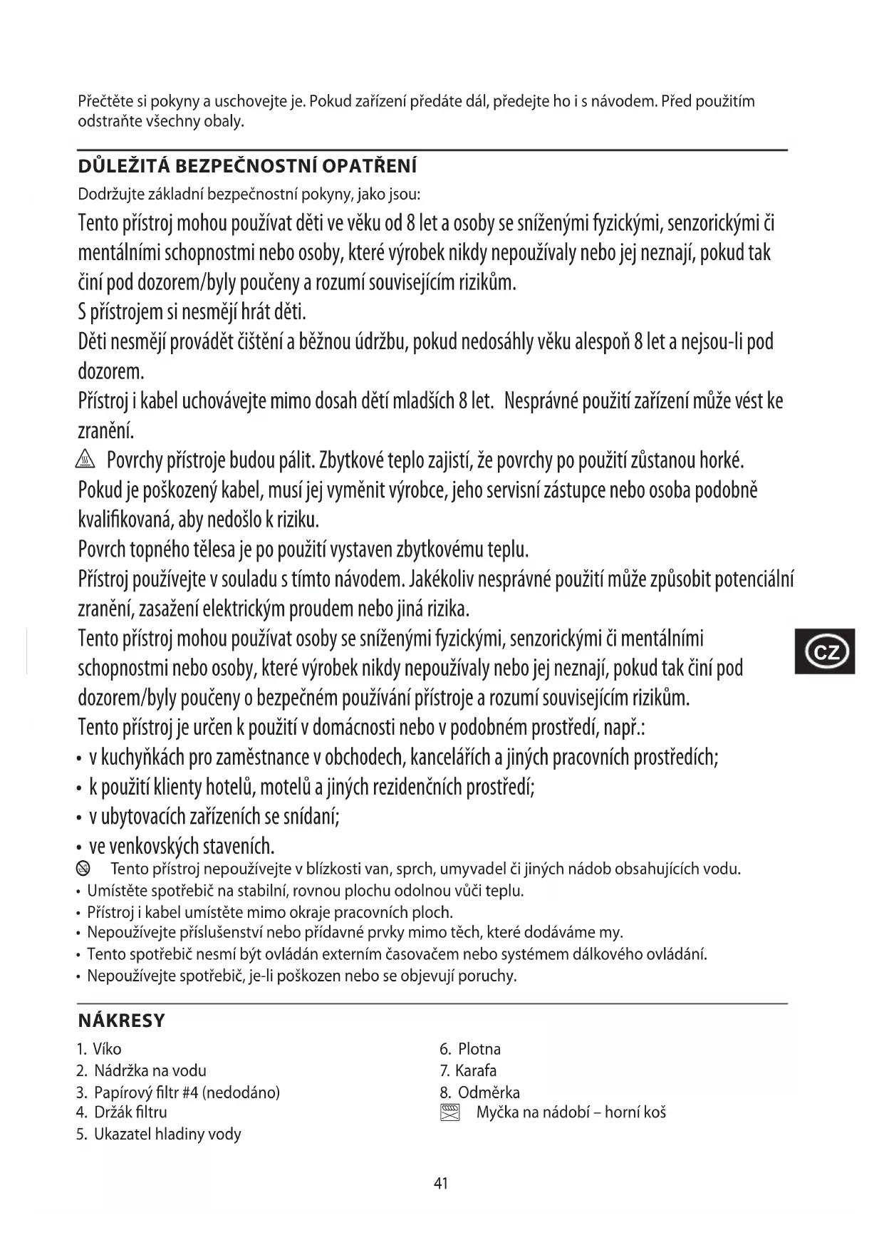 Přečtěte si pokyny a uschovejte je. Pokud zařízení předáte dál, předejte ho i s návodem. Před použitím odstraňte všechny obaly. DŮLEŽITÁ BEZPEČNOSTNÍ OPATŘENÍ Dodržujte základní bezpečnostní pokyny, jako jsou: Tento přístroj mohou používat děti ve věku od 8 let a osoby se sníženými fyzickými, senzorickými či mentálními schopnostmi nebo osoby, které výrobek nikdy nepoužívaly nebo jej neznají, pokud tak činí pod dozorem/byly poučeny a rozumí souvisejícím rizikům. S přístrojem si nesmějí hrát děti. Děti nesmějí provádět čištění a běžnou údržbu, pokud nedosáhly věku alespoň 8 let a nejsou-li pod dozorem. Přístroj i kabel uchovávejte mimo dosah dětí mladších 8 let. Nesprávné použití zařízení může vést ke zranění. h Povrchy přístroje budou pálit. Zbytkové teplo zajistí, že povrchy po použití zůstanou horké. Pokud je poškozený kabel, musí jej vyměnit výrobce, jeho servisní zástupce nebo osoba podobně kvalikovaná, aby nedošlo k riziku. Povrch topného tělesa je po použití vystaven zbytkovému teplu. Přístroj používejte v souladu s tímto návodem. Jakékoliv nesprávné použití může způsobit potenciální zranění, zasažení elektrickým proudem nebo jiná rizika. Tento přístroj mohou používat osoby se sníženými fyzickými, senzorickými či mentálními schopnostmi nebo osoby, které výrobek nikdy nepoužívaly nebo jej neznají, pokud tak činí pod dozorem/byly poučeny o bezpečném používání přístroje a rozumí souvisejícím rizikům. Tento přístroj je určen k použití v domácnosti nebo v podobném prostředí, např.: