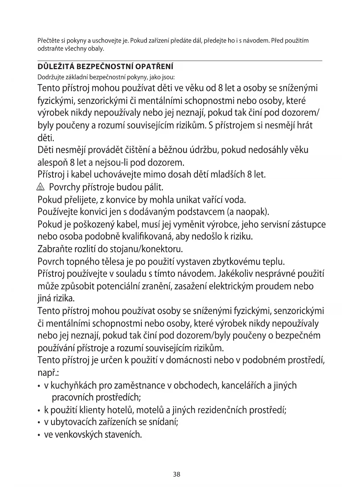 AE38 Přečtěte si pokyny a uschovejte je. Pokud zařízení předáte dál, předejte ho i s návodem. Před použitím odstraňte všechny obaly. DŮLEŽITÁ BEZPEČNOSTNÍ OPATŘENÍ Dodržujte základní bezpečnostní pokyny, jako jsou: Tento přístroj mohou používat děti ve věku od 8 let a osoby se sníženými fyzickými, senzorickými či mentálními schopnostmi nebo osoby, které výrobek nikdy nepoužívaly nebo jej neznají, pokud tak činí pod dozorem/ byly poučeny a rozumí souvisejícím rizikům. S přístrojem si nesmějí hrát děti. Děti nesmějí provádět čištění a běžnou údržbu, pokud nedosáhly věku alespoň 8 let a nejsou-li pod dozorem. Přístroj i kabel uchovávejte mimo dosah dětí mladších 8 let. h Povrchy přístroje budou pálit. Pokud přelijete, z konvice by mohla unikat vařící voda. Používejte konvici jen s dodávaným podstavcem (a naopak). Pokud je poškozený kabel, musí jej vyměnit výrobce, jeho servisní zástupce nebo osoba podobně kvalikovaná, aby nedošlo k riziku. Zabraňte rozlití do stojanu/konektoru. Povrch topného tělesa je po použití vystaven zbytkovému teplu. Přístroj používejte v souladu s tímto návodem. Jakékoliv nesprávné použití může způsobit potenciální zranění, zasažení elektrickým proudem nebo jiná rizika. Tento přístroj mohou používat osoby se sníženými fyzickými, senzorickými či mentálními schopnostmi nebo osoby, které výrobek nikdy nepoužívaly nebo jej neznají, pokud tak činí pod dozorem/byly poučeny o bezpečném používání přístroje a rozumí souvisejícím rizikům. Tento přístroj je určen k použití v domácnosti nebo v podobném prostředí, např.: