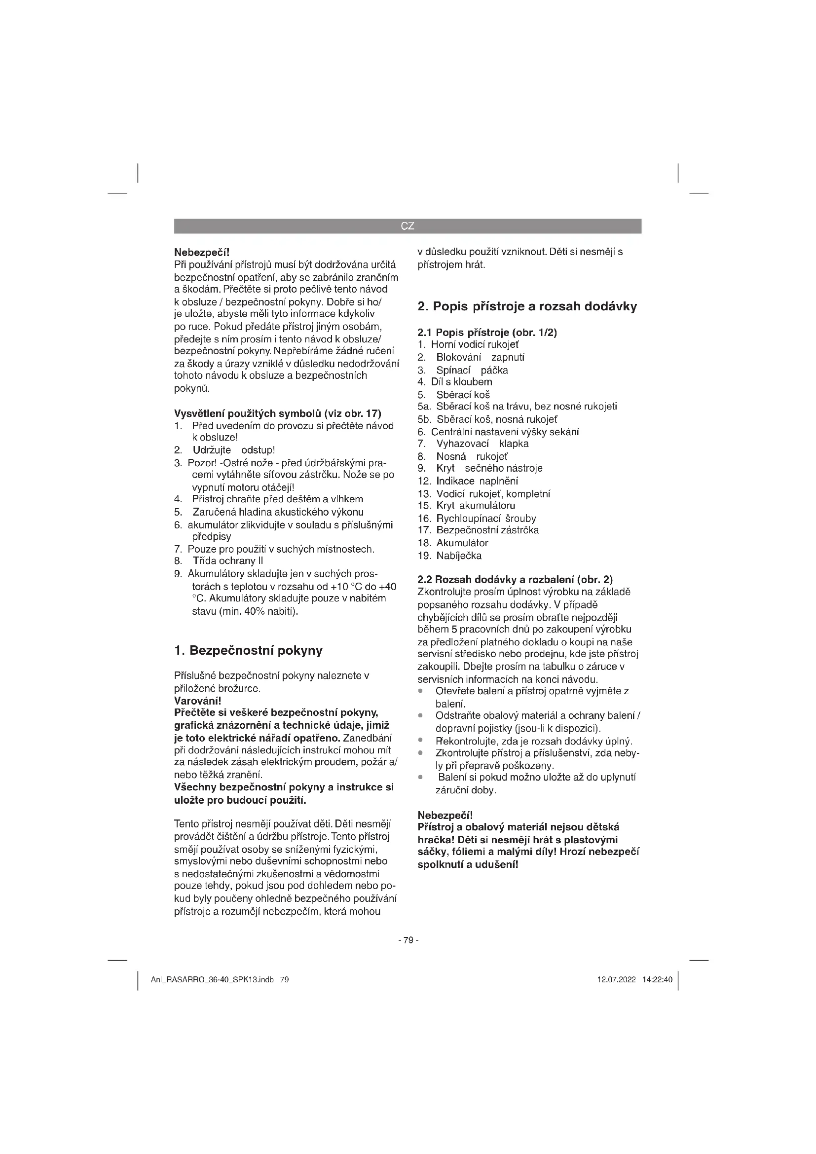 Pozor! Sekačka je vybavena bezpečnostním spínačem, aby se zamezilo používání nepovolanými osoba- mi. Bezprostředně před uvedením sekačky do provozu zasuňte bezpečnostní zástrčku (obr. 15 / pol. 17) a při každém přerušení nebo ukončení práce zástrčku opět vytáhněte. Pozor! Aby se zabránilo nechtěnému zapnutí, je sekačka vybavena blokováním zapnutí (obr. 1 / pol. 2), kte- ré se musí zmáčknout, než může být aktivována spínací páčka (obr. 1 / pol. 3). Pokud se spínací páčka pustí, sekačka se vypne. Doba startu může činit až několik sekund. Proveďte tento krok několikrát, abyste si byli jisti, že váš přístroj správně pracuje. Před začátkem opravárenských nebo údržbářských prací na přístroji se musíte přesvědčit, že se nůž netočí a bezpečnostní zástrčka je vytažena. Varování! Nikdy neotvírejte vyhazovací klap- ku, když je vyprazdňováno sběrací zařízení a motor ještě běží. Rotující nůž může způsobit zranění. Vždy pečlivě upevněte vyhazovací klapku resp. sběrací koš. Při odstraňování nejdříve vypnout motor. Anl_RASARRO_36-40_SPK13.indb 82Anl_RASARRO_36-40_SPK13.indb 82 12.07.2022 14:22:4112.07.2022 14:22:41CZ