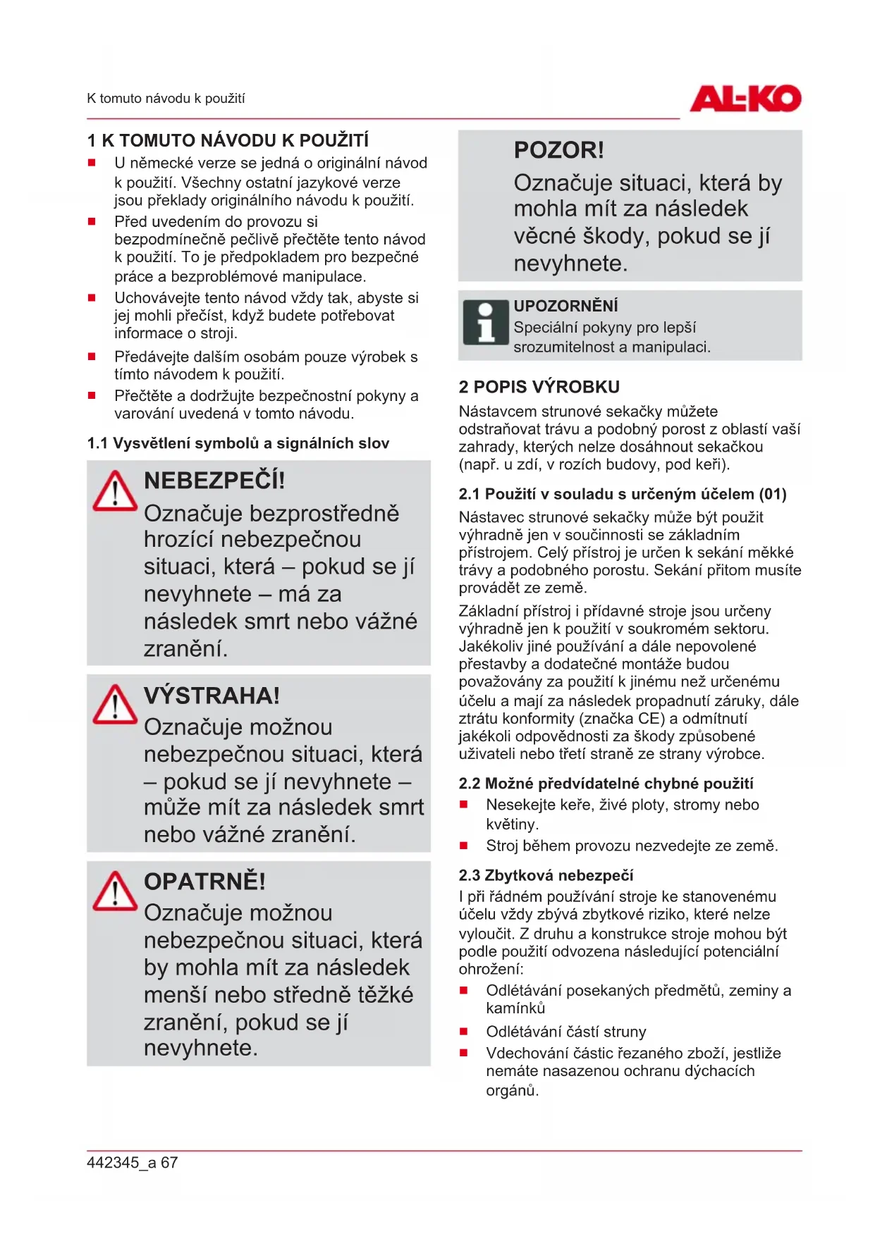 Nástavec strunové sekačky může být použit výhradně jen v součinnosti se základním přístrojem. Celý přístroj je určen k sekání měkké trávy a podobného porostu. Sekání přitom musíte provádět ze země. Základní přístroj i přídavné stroje jsou určeny výhradně jen k použití v soukromém sektoru. Jakékoliv jiné používání a dále nepovolené přestavby a dodatečné montáže budou považovány za použití k jinému než určenému účelu a mají za následek propadnutí záruky, dále ztrátu konformity (značka CE) a odmítnutí jakékoli odpovědnosti za škody způsobené uživateli nebo třetí straně ze strany výrobce.