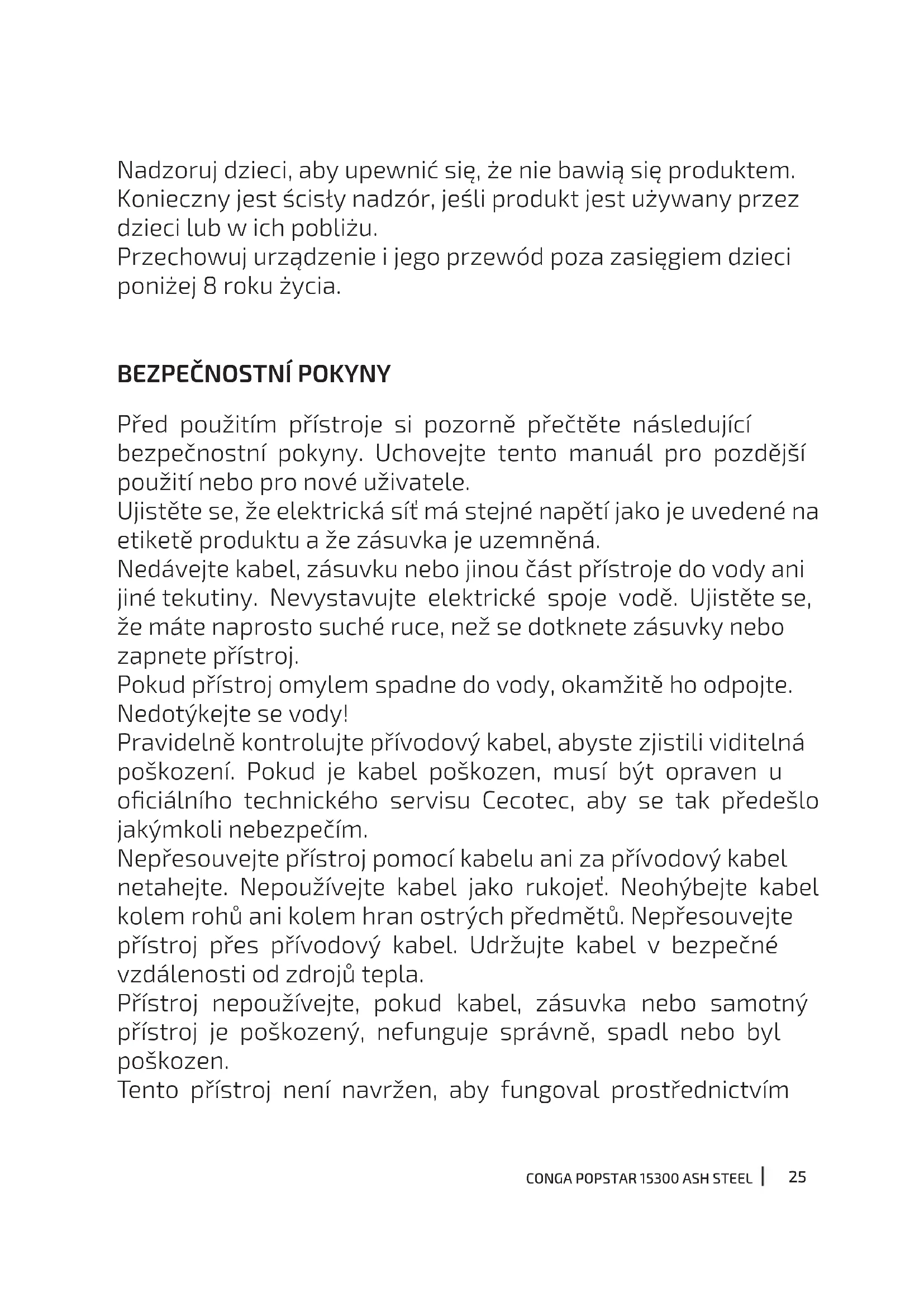 Před použitím přístroje si pozorně přečtěte následující bezpečnostní pokyny. Uchovejte tento manuál pro pozdější použití nebo pro nové uživatele. Ujistěte se, že elektrická síť má stejné napětí jako je uvedené na etiketě produktu a že zásuvka je uzemněná. Nedávejte kabel, zásuvku nebo jinou část přístroje do vody ani jiné tekutiny. Nevystavujte elektrické spoje vodě. Ujistěte se, že máte naprosto suché ruce, než se dotknete zásuvky nebo zapnete přístroj. Pokud přístroj omylem spadne do vody, okamžitě ho odpojte. Nedotýkejte se vody! Pravidelně kontrolujte přívodový kabel, abyste zjistili viditelná poškození. Pokud je kabel poškozen, musí být opraven u ociálního technického servisu Cecotec, aby se tak předešlo jakýmkoli nebezpečím. Nepřesouvejte přístroj pomocí kabelu ani za přívodový kabel netahejte. Nepoužívejte kabel jako rukojeť. Neohýbejte kabel kolem rohů ani kolem hran ostrých předmětů. Nepřesouvejte přístroj přes přívodový kabel. Udržujte kabel v bezpečné vzdálenosti od zdrojů tepla. Přístroj nepoužívejte, pokud kabel, zásuvka nebo samotný přístroj je poškozený, nefunguje správně, spadl nebo byl poškozen. Tento přístroj není navržen, aby fungoval prostřednictvím26