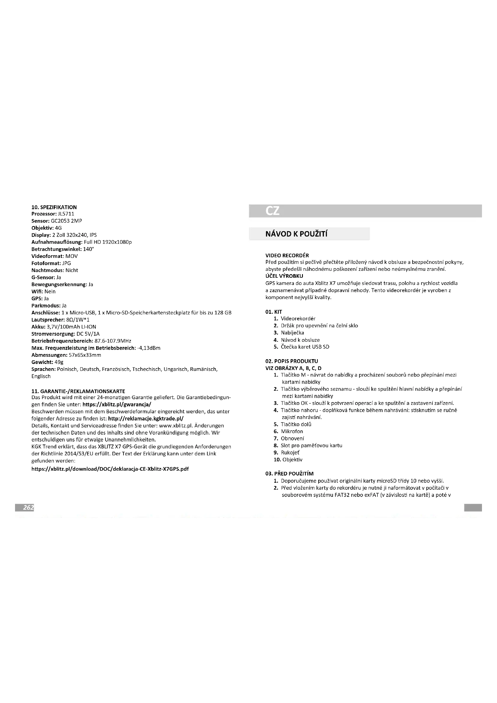 Na výrobek se vztahuje záruka 24 měsíců. Záruční podmínky naleznete na adrese: hps://xblitz.pl/gwarancja/. Sžnos se podávají prostřednictvím formuláře sžnos, který najdete na adrese: hp://reklamacje.kgktrade.pl/. Podrobnos, kontakt a adresu pro poskytování služeb naleznete na adrese: www. xblitz.pl. Specikace a obsah se mohou změnit bez předchozího upozornění. Omlo- uváme se za případné nepříjemnos. Společnost KGK Trend prohlašuje, že zařízení XBLITZ X7 GPS splňuje základní poža- davky směrnice 2014/53/EU. Text prohlášení naleznete na tomto odkazu: hps://xblitz.pl/download/DOC/deklaracja-CE-Xblitz-X7GPS.pdf VIDEÓREMONDÓ Használat elő gyelmesen olvassa el a mellékelt használa utasítást és a biztonsági megjegyzéseket, hogy elkerülje a berendezés véletlen károsodását vagy a véletlen sérülést.