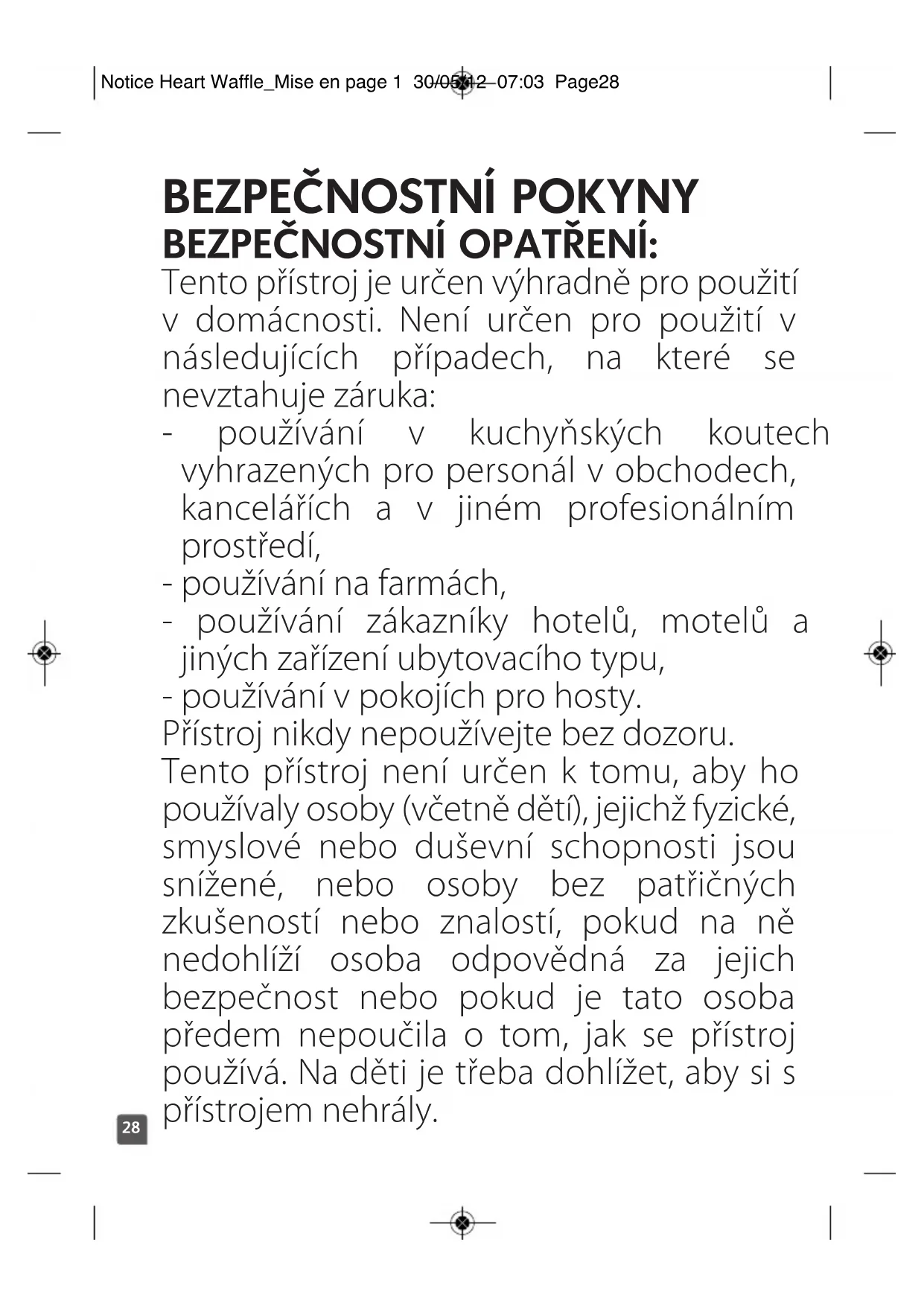 BEZPEČNOSTNÍ OPATŘENÍ: Tento přístroj je určen výhradně pro použití v domácnosti. Není určen pro použití v následujících případech, na které se nevztahuje záruka: - používání v kuchyňských koutech vyhrazených pro personál v obchodech, kancelářích a v jiném profesionálním prostředí, - používání na farmách, - používání zákazníky hotelů, motelů a jiných zařízení ubytovacího typu, - používání v pokojích pro hosty. Přístroj nikdy nepoužívejte bez dozoru. Tento přístroj není určen k tomu, aby ho používaly osoby (včetně dětí), jejichž fyzické, smyslové nebo duševní schopnosti jsou snížené, nebo osoby bez patřičných zkušeností nebo znalostí, pokud na ně nedohlíží osoba odpovědná za jejich bezpečnost nebo pokud je tato osoba předem nepoučila o tom, jak se přístroj používá. Na děti je třeba dohlížet, aby si s přístrojem nehrály. Notice Heart Waffle_Mise en page 1 30/05/12 07:03 Page2829