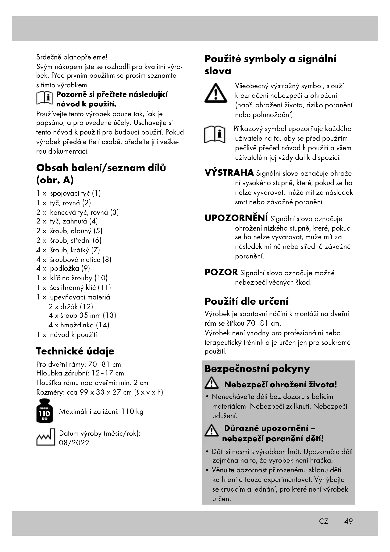 Maximální zatížení: 110 kg Datum výroby (měsíc/rok): 08/2022 Použité symboly a signální slova Všeobecný výstražný symbol, slouží k označení nebezpečí a ohrožení (např. ohrožení života, riziko poranění nebo pohmoždění). Příkazový symbol upozorňuje každého uživatele na to, aby se před použitím pečlivě přečetl návod k použití a všem uživatelům jej vždy dal k dispozici. VÝSTRAHA Signální slovo označuje ohrože- ní vysokého stupně, které, pokud se ho nelze vyvarovat, může mít za následek smrt nebo závažné poranění. UPOZORNĚNÍ Signální slovo označuje ohrožení nízkého stupně, které, pokud se ho nelze vyvarovat, může mít za následek mírně nebo středně závažné poranění. POZOR Signální slovo označuje možné nebezpečí věcných škod. Použití dle určení Výrobek je sportovní náčiní k montáži na dveřní rám se šířkou 70–81 cm. Výrobek není vhodný pro profesionální nebo terapeutický trénink a je určen jen pro soukromé použití. Bezpečnostní pokyny Nebezpečí ohrožení života!