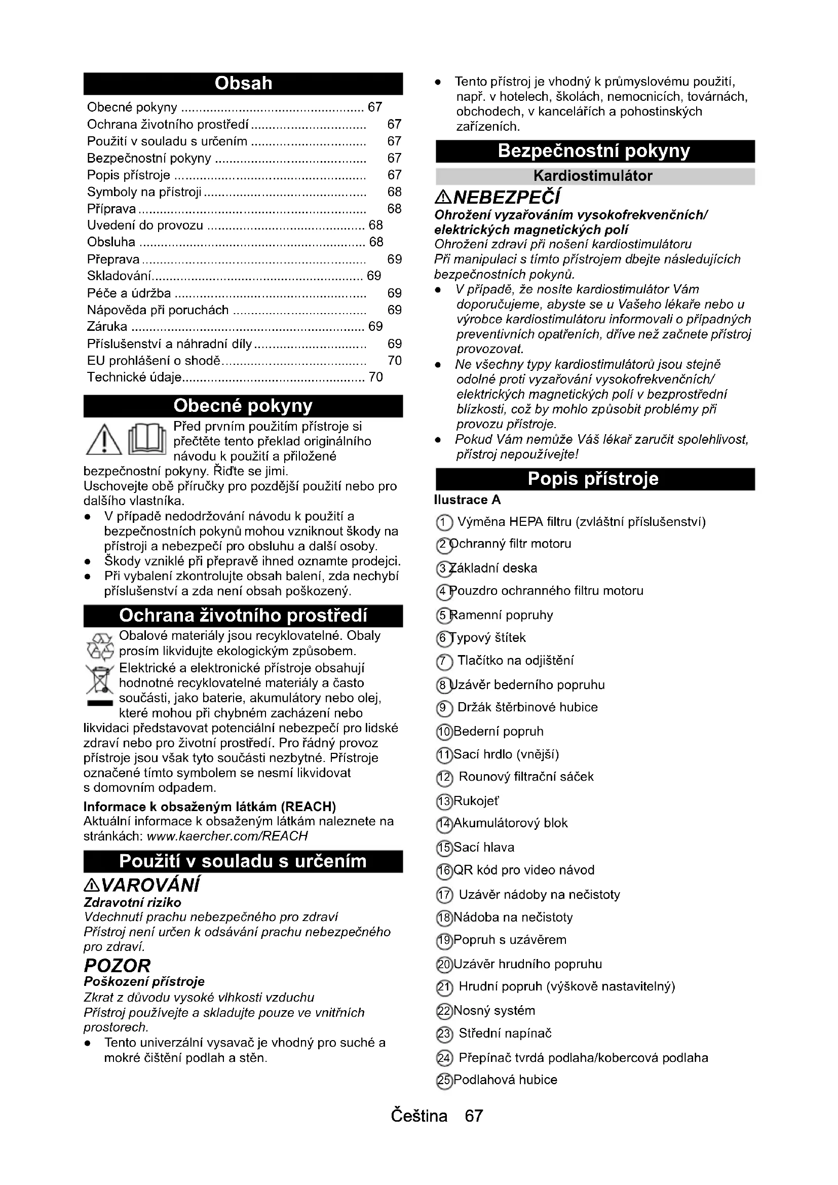 - 0,2Čeština 67 Obsah Obecné pokyny Před prvním použitím přístroje si přečtěte tento překlad originálního návodu k použití a přiložené bezpečnostní pokyny. Řiďte se jimi. Uschovejte obě příručky pro pozdější použití nebo pro dalšího vlastníka. ● V případě nedodržování návodu k použití a bezpečnostních pokynů mohou vzniknout škody na přístroji a nebezpečí pro obsluhu a další osoby. ● Škody vzniklé při přepravě ihned oznamte prodejci. ● Při vybalení zkontrolujte obsah balení, zda nechybí příslušenství a zda není obsah poškozený. Ochrana životního prostředí Obalové materiály jsou recyklovatelné. Obaly prosím likvidujte ekologickým způsobem. Elektrické a elektronické přístroje obsahují hodnotné recyklovatelné materiály a často součásti, jako baterie, akumulátory nebo olej, které mohou při chybném zacházení nebo likvidaci představovat potenciální nebezpečí pro lidské zdraví nebo pro životní prostředí. Pro řádný provoz přístroje jsou však tyto součásti nezbytné. Přístroje označené tímto symbolem se nesmí likvidovat s domovním odpadem. Informace k obsaženým látkám (REACH) Aktuální informace k obsaženým látkám naleznete na stránkách: www.kaercher.com/REACH Použití v souladu s určením 몇 VAROVÁNÍ Zdravotní riziko Vdechnutí prachu nebezpečného pro zdraví Přístroj není určen k odsávání prachu nebezpečného pro zdraví. POZOR Poškození přístroje Zkrat z důvodu vysoké vlhkosti vzduchu Přístroj používejte a skladujte pouze ve vnitřních prostorech. ● Tento univerzální vysavač je vhodný pro suché a mokré čištění podlah a stěn. ● Te nto p řístroj je vhodný k průmyslovému použití, např. v hotelech, školách, nemocnicích, továrnách, obchodech, v kancelářích a pohostinských zařízeních. Bezpečnostní pokyny Kardiostimulátor NEBEZPEČÍ Ohrožení vyzařováním vysokofrekvenčních/ elektrických magnetických polí Ohrožení zdraví při nošení kardiostimulátoru Při manipulaci s tímto přístrojem dbejte následujících bezpečnostních pokynů. ● V případě, že nosíte kardiostimulátor Vám doporučujeme, abyste se u Vašeho lékaře nebo u výrobce kardiostimulátoru informovali o případných preventivních opatřeních, dříve než začnete přístroj provozovat. ● Ne všechny typy kardiostimulátorů jsou stejně odolné proti vyzařování vysokofrekvenčních/ elektrických magnetických polí v bezprostřední blízkosti, což by mohlo způsobit problémy při provozu přístroje. ● Pokud Vám nemůže Váš lékař zaručit spolehlivost, přístroj nepoužívejte! Popis přístroje Ilustrace A 1 Výměna HEPA filtru (zvláštní příslušenství) 2 Ochranný filtr motoru 3 Základní deska 4 Pouzdro ochranného filtru motoru 5 Ramenní popruhy 6 Typový štítek 7 Tlačítko na odjištění 8 Uzávěr bederního popruhu 9 Držák štěrbinové hubice 10 Bederní popruh 11 Sací hrdlo (vnější) 12 Rounový filtrační sáček 13 Rukojeť 14 Akumulátorový blok 15 Sací hlava 16 QR kód pro video návod 17 Uzávěr nádoby na nečistoty 18 Nádoba na nečistoty 19 Popruh s uzávěrem 20 Uzávěr hrudního popruhu 21 Hrudní popruh (výškově nastavitelný) 22 Nosný systém 23 Střední napínač 24 Přepínač tvrdá podlaha/kobercová podlaha 25 Podlahová hubice Obecné pokyny p. 67