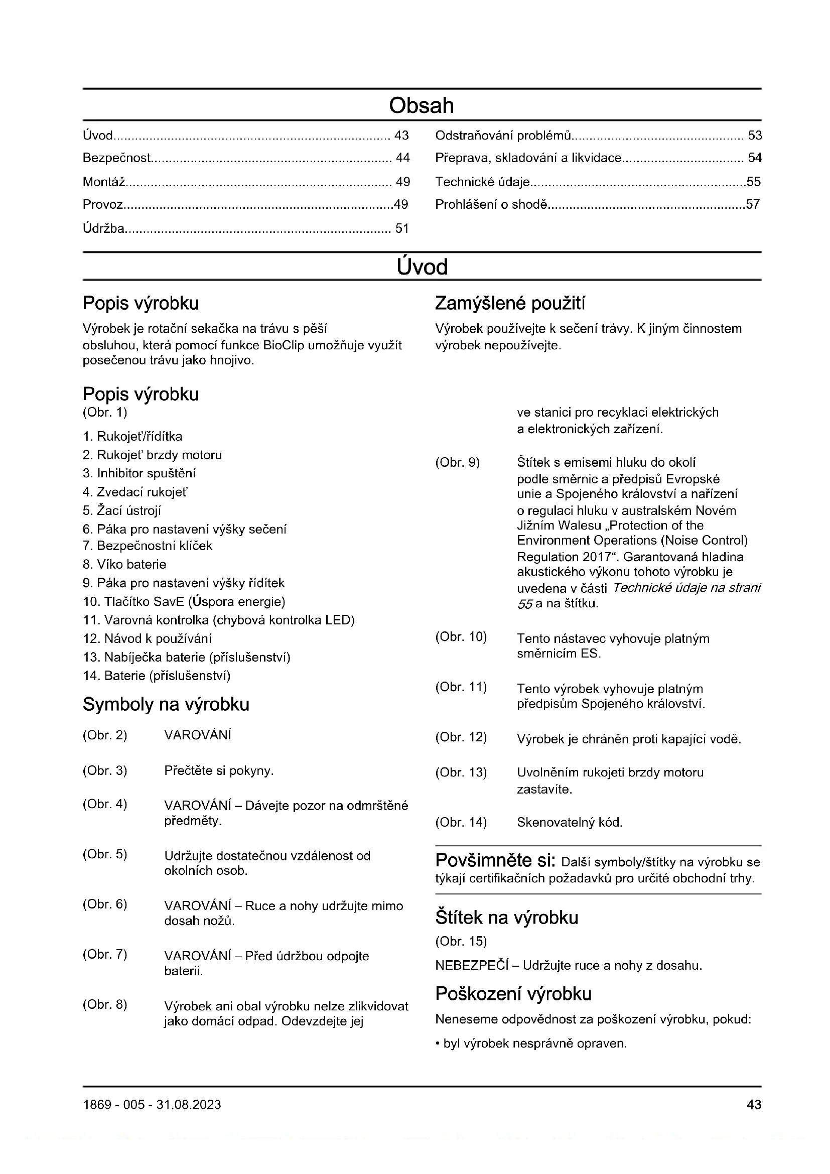 Symboly na výrobku (Obr. 2) VAROVÁNÍ (Obr. 3) Přečtěte si pokyny. (Obr. 4) VAROVÁNÍ– Dávejte pozor na odmrštěné předměty. (Obr. 5) Udržujte dostatečnou vzdálenost od okolních osob. (Obr. 6) VAROVÁNÍ– Ruce anohy udržujte mimo dosah nožů. (Obr. 7) VAROVÁNÍ– Před údržbou odpojte baterii. (Obr. 8) Výrobek ani obal výrobku nelze zlikvidovat jako domácí odpad. Odevzdejte jej ve stanici pro recyklaci elektrických aelektronických zařízení. (Obr. 9) Štítek semisemi hluku do okolí podle směrnic apředpisů Evropské unie aSpojeného království anařízení oregulaci hluku vaustralském Novém Jižním Walesu „Protection of the Environment Operations (Noise Control) Regulation 2017“. Garantovaná hladina akustického výkonu tohoto výrobku je uvedena včásti Technické údaje na strani