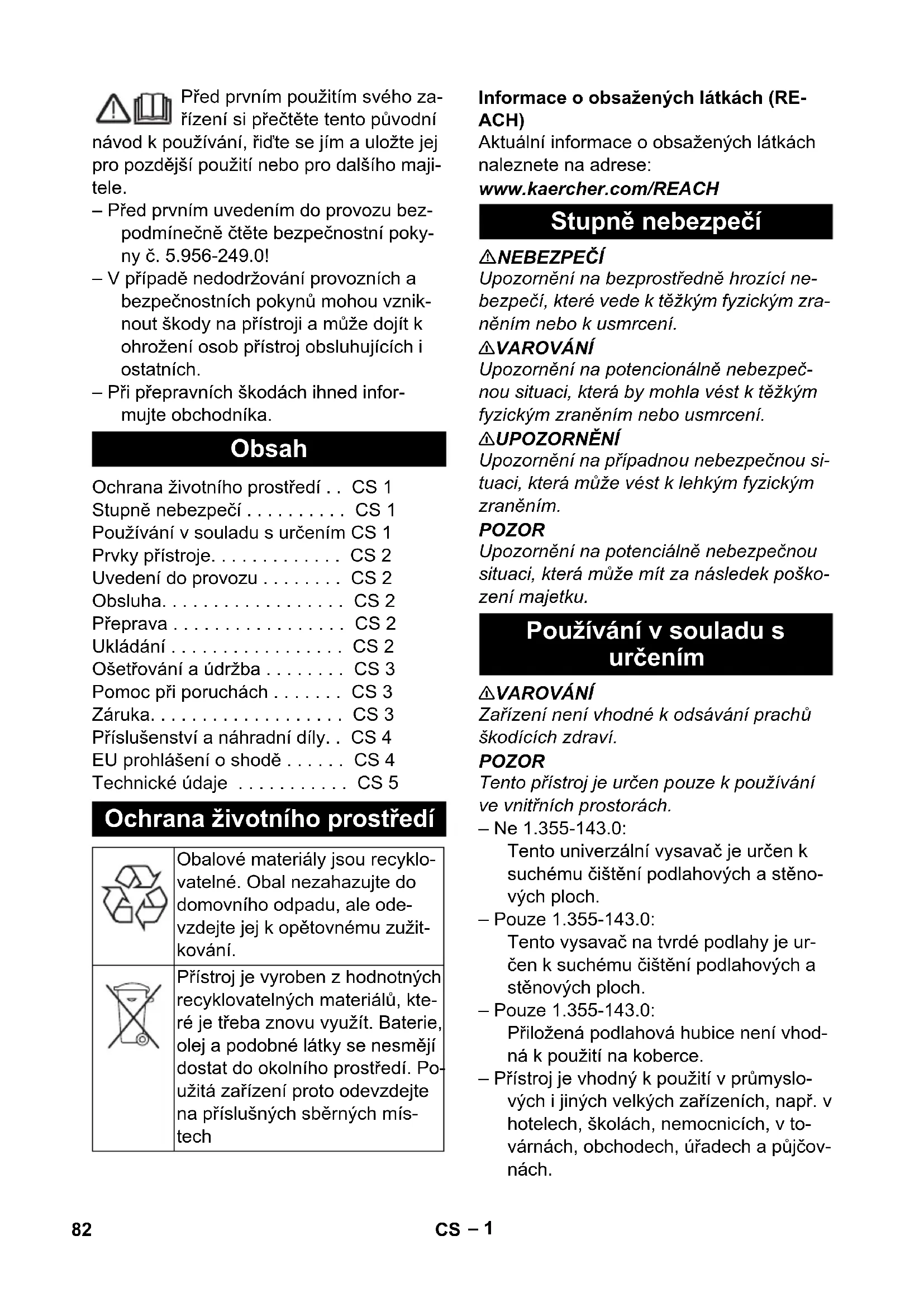 Alkatrész szám Kábelhos- szúság EU 6.650-622.0 12 m GB 6.650-641.0 12 m CH 6.650-638.0 12 m 81HU– 1 Před prvním použitím svého za- řízení si přečtěte tento původní návod k používání, řiďte se jím a uložte jej pro pozdější použití nebo pro dalšího maji- tele. – Před prvním uvedením do provozu bez- podmínečně čtěte bezpečnostní poky- ny č. 5.956-249.0! – V případě nedodržování provozních a bezpečnostních pokynů mohou vznik- nout škody na přístroji a může dojít k ohrožení osob přístroj obsluhujících i ostatních. – Při přepravních škodách ihned infor- mujte obchodníka. Informace o obsažených látkách (RE- ACH) Aktuální informace o obsažených látkách naleznete na adrese: www.kaercher.com/REACH NEBEZPEČÍ Upozornění na bezprostředně hrozící ne- bezpečí, které vede k těžkým fyzickým zra- něním nebo k usmrcení. 몇 VAROVÁNÍ Upozornění na potencionálně nebezpeč- nou situaci, která by mohla vést k těžkým fyzickým zraněním nebo usmrcení. 몇 UPOZORNĚNÍ Upozornění na případnou nebezpečnou si- tuaci, která může vést k lehkým fyzickým zraněním. POZOR Upozornění na potenciálně nebezpečnou situaci, která může mít za následek poško- zení majetku. 몇 VAROVÁNÍ Zařízení není vhodné k odsávání prachů škodících zdraví. POZOR Tento přístroj je určen pouze k používání ve vnitř ních prostorách. – Ne 1.355-143.0: Tento univerzální vysavač je určen k suchému čištění podlahových a stěno- vých ploch. – Pouze 1.355-143.0: Tento vysavač na tvrdé podlahy je ur- čen k suchému čištění podlahových a stěnových ploch. – Pouze 1.355-143.0: Přiložená podlahová hubice není vhod- ná k použití na koberce. – Přístroj je vhodný k použití v průmyslo- vých i jiných velkých zařízeních, např. v hotelech, školách, nemocnicích, v to- várnách, obchodech, úřadech a půjčov- nách. Obsah Ochrana životního prostředí . . CS 1 Stupně nebezpečí . . . . . . . . . . CS 1 Používání v souladu s určením CS 1 Prvky přístroje. . . . . . . . . . . . . CS 2 Uvedení do provozu . . . . . . . . CS 2 Obsluha. . . . . . . . . . . . . . . . . . CS 2 Přeprava . . . . . . . . . . . . . . . . . CS 2 Ukládání . . . . . . . . . . . . . . . . . CS 2 Ošetřování a údržba . . . . . . . . CS 3 Pomoc při poruchách . . . . . . . CS 3 Záruka. . . . . . . . . . . . . . . . . . . CS 3 Příslušenství a náhradní díly. . CS 4 EU prohlášení o shodě . . . . . . CS 4 Technické údaje . . . . . . . . . . . CS 5 Ochrana životního prostředí Obalové materiály jsou recyklo- vatelné. Obal nezahazujte do domovního odpadu, ale ode- vzdejte jej k opětovnému zužit- kování. Přístroj je vyroben z hodnotných recyklovatelných materiálů, kte- ré je třeba znovu využít. Baterie, olej a podobné látky se nesmějí dostat do okolního prostředí. Po- užitá zařízení proto odevzdejte na příslušných sběrných mís- tech Stupně nebezpečí Používání v souladu s určením 82 CS– 2 1 Filtrační sáček z netkané textilie 2 Sací hrdlo 3 Sací hadice 4 typový štítek 5 Kabelový hák 6 Držadlo 7 Sít'ový kabel 8 Vysávací hlavice 9 Uzamčení sací hlavy 10 Řídicí válec 11 Nádoba na nečistoty 12 Zásuvka pro elektrický sací kartáč 13 Hlavní spínač 14 Přepínání pevná podlaha/koberce (v závislosti na vybavení) 15 Hubice na čištění podlah 16 Sací hubice 17 Upevnění zástrčky do sítě 18 Vybrání na podlahovou hubici 19 Zajištění krytu 20 Kryt 21 Těleso filtru 22 Filtr odváděného vzduchu 23 Regulátor sací síly (plynule regulovatel- né) 24 Násadka 25 Hlavní filtrační koš 26 Ochranný filtr motoru – Obslužné prvky čisticího procesu jsou žluté. – Obslužné prvky údržby a servisních oprav jsou světle šedé. Zkontrolujte, zda je hlavní filtrační koš nasazen v zařízení. 1 Provoz s filtračním sáčkem z netkané textilie nebo z papíru (zvláštní příslu- šenství) 2 Provoz bez filtračního sáčku Odjistěte vysávací hlavici a sejměte ji. Vyjměte hlavní filtrační koš. Nasaďte filtrační sáček z netkané texti- lie nebo z papíru (zvláštní příslušen- ství). Nasaďte hlavní filtrační koš. Nasaďte vysávací hlavici a zajistěte ji. Zasuňte sít'ovou zástrčku do zásuvky. Zapněte přístroj hlavním spínačem. Přepínání podlahové hubice nastavte na pevnou podlahu nebo koberec. Regulujte sací sílu pomocí příslušného regulátoru (plynule nastavitelného) Provést čištění. Vypněte přístroj hlavním spínačem. Vytáhněte zástrčku ze sítě. Nádobu vyprázdněte Přístroj odsajte a utřete uvnitř i vně vlh- kým hadrem. 몇 UPOZORNĚNÍ Nebezpečí úrazu a nebezpečí poškození! Dbejte na hmotnost přístroje při přepravě. Při přepravě v dopravních prostředcích zajistěte zařízení proti skluzu a překlo- pení podle platných předpisů. 몇 UPOZORNĚNÍ Nebezpečí úrazu a nebezpečí poškození! Dbejte na hmotnost přístroje při jeho uskladnění. Toto zařízení smí být uskladněno pouze v uzavřených prostorách. Prvky přístroje Barevné označení Uvedení do provozu Provozní režimy Montáž filtračního sáčku Obsluha Zapnutí přístroje Čisticí provoz Vypnutí zařízení Po každém použití Přeprava Ukládání 83CS– 3 NEBEZPEČÍ Před každou prací na zařízení vždy zaříze- ní vypněte a vytáhněte síťovou zástrčku. Hlavní filtrační koš (omyvatelný) dle po- třeby očistěte pod tekoucí vodou. POZOR Nebezpečí poškození! Hlavní filtrační koš nenasazujte nikdy mokrý. Filtr odváděného vzduchu: vyměňujte 1x ročně Odjistěte kryt a sejměte jej. Vyjměte těleso filtru. Filtr odváděného vzduchu vyjměte z pouzdra filtru. Do pouzdra filtru nasaďte nový filtr od- váděného vzduchu. Nasaďte t
