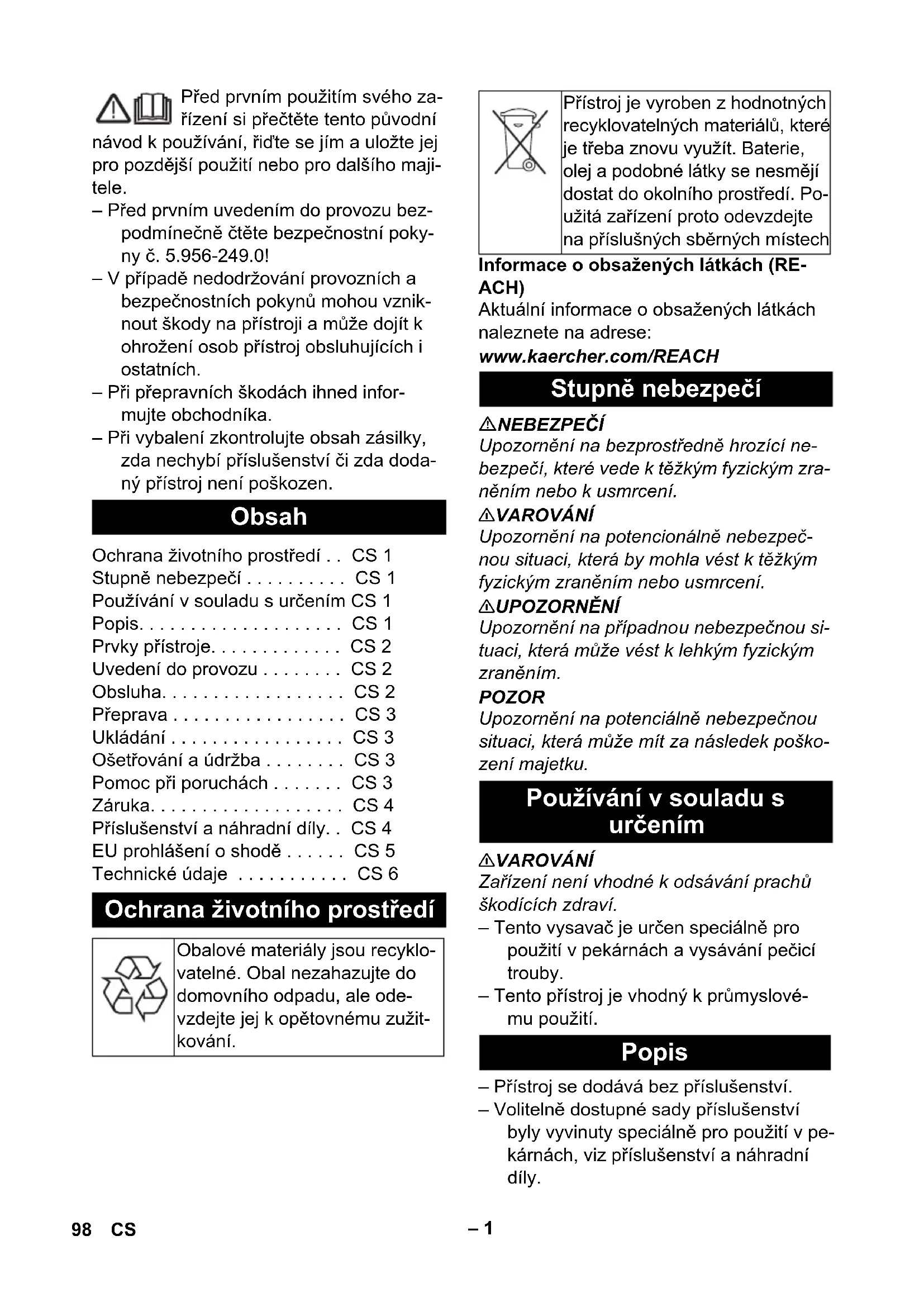 Alkatrész szám Kábelhosszú- ság EU 6.650-591.0 7,5 m 97HU– 1 Před prvním použitím svého za- řízení si přečtěte tento původní návod k používání, řiďte se jím a uložte jej pro pozdější použití nebo pro dalšího maji- tele. – Před prvním uvedením do provozu bez- podmínečně čtěte bezpečnostní poky- ny č. 5.956-249.0! – V případě nedodržování provozních a bezpečnostních pokynů mohou vznik- nout škody na přístroji a může dojít k ohrožení osob přístroj obsluhujících i ostatních. – Při přepravních škodách ihned infor- mujte obchodníka. – Při vybalení zkontrolujte obsah zásilky, zda nechybí příslušenství či zda doda- ný přístroj není poškozen. Informace o obsažených látkách (RE- ACH) Aktuální informace o obsažených látkách naleznete na adrese: www.kaercher.com/REACH NEBEZPEČÍ Upozornění na bezprostředně hrozící ne- bezpečí, které vede k těžkým fyzickým zra- něním nebo k usmrcení. 몇 VAROVÁNÍ Upozornění na potencionálně nebezpeč- nou situaci, která by mohla vést k těžkým fyzickým zraněním nebo usmrcení. 몇 UPOZORNĚNÍ Upozornění na případnou nebezpečnou si- tuaci, která může vést k lehkým fyzickým zraněním. POZOR Upozornění na potenciálně nebezpečnou situaci, která může mít za následek poško- zení majetku. 몇 VAROVÁNÍ Zařízení není vhodné k odsávání prachů škodících zdraví. – Tento vysavač je určen speciálně pro použití v pekárnách a vysávání pečicí trouby. – Tento přístroj je vhodný k průmyslové- mu použití. – Přístroj se dodává bez příslušenství. – Volitelně dostupné sady příslušenství byly vyvinuty speciálně pro použití v pe- kárnách, viz příslušenství a náhradní díly. Obsah Ochrana životního prostředí . . CS 1 Stupně nebezpečí . . . . . . . . . . CS 1 Používání v souladu s určením CS 1 Popis. . . . . . . . . . . . . . . . . . . . CS 1 Prvky přístroje. . . . . . . . . . . . . CS 2 Uvedení do provozu . . . . . . . . CS 2 Obsluha. . . . . . . . . . . . . . . . . . CS 2 Přeprava . . . . . . . . . . . . . . . . . CS 3 Ukládání . . . . . . . . . . . . . . . . . CS 3 Ošetřování a údržba . . . . . . . . CS 3 Pomoc při poruchách . . . . . . . CS 3 Záruka. . . . . . . . . . . . . . . . . . . CS 4 Příslušenství a náhradní díly. . CS 4 EU prohlášení o shodě . . . . . . CS 5 Technické údaje . . . . . . . . . . . CS 6 Ochrana životního prostředí Obalové materiály jsou recyklo- vatelné. Obal nezahazujte do domovního odpadu, ale ode- vzdejte jej k opětovnému zužit- kování. Přístroj je vyroben z hodnotných recyklovatelných materiálů, které je třeba znovu využít. Baterie, olej a podobné látky se nesmějí dostat do okolního prostředí. Po- užitá zařízení proto odevzdejte na příslušných sběrných místech Stupně nebezpečí Používání v souladu s určením Popis 98 CS– 2 1 Elektrody 2 Držák na sací trubku 3 Posuvné rameno 4 Hák na hadici 5 Vývod vzduchu, pracovní vzduch 6 Vysávací hlavice 7 Uzamčení sací hlavy 8 Úchopová zaoblina 9 Nádoba na nečistoty 10 Řídicí válec 11 Rukojet' 12 Přívod vzduchu, Chladicí vzduch v mo- toru 13 Sací hrdlo 14 Doraz pro nástrojový kufr 15 Upevňovací oko 16 Kryt filtru 17 Držadlo 18 Otočný spínač 19 Držák podlahové trysky nebo trysky pro pec 20 Upevňovací šroub posuvného ramene 21 Sít'ový kabel 22 Filtrační rám 23 Plochý skládaný filtr (PES) 24 Čištění filtru 25 typový štítek POZOR Při vysávání se nesmí v žádném případě fil- trační skládaný sáček vyjmout. Statické náboje jsou odváděny prostřednic- tvím uzemněného připojovacího hrdla. Toto opatření zamezuje tvorbu jisker a proudových nárazů s elektricky vodivým příslušenstvím (volitelný nadstandard). – Při vysávání mokrých nečistot hubicí na čalounění nebo štěrbinovou hubicí re- sp. vysává-li se převážně voda z nádr- že, doporučujeme Vám vypnout funkci „Automatické čištění filtru“. – Dosáhne-li tekutina maximálního stavu, přístroj se automaticky vypne. – V případě nevodivých tekutin (vrtací emulze, oleje, maziva) se přístroj při plné nádrži nevypne. Množství teku- tiny je třeba průběžně kontrolovat a nádrž včas vyprázdnit. – Po ukončení mokrého sání: Očistěte plochý skládaný filtr pomocí čištění filtru. Vyčistěte elektrody kartáčkem. Nádoby vyčistěte vlhkým hadrem a osušte. ilustrace Sací hadice (zvláštní příslušenství) je vyba- vena klipovým systémem. Připojit lze všechny díly příslušenství se jmenovitou světlostí 35 mm. POZOR Nejpozději po 50 čištěních pečicí pece je třeba vyměnit plochý skládaný filtr. POZOR Aby byl zajištěn bezpečný provoz vysava- če, nesmí se v žádném případě nasávat horký vzduch (max. teplota 200 °C) po dobu delší než 5 minut bez přerušení. Zasuňte sít'ovou zástrčku do zásuvky. Nastavte otočný spínač na požadované program. Prvky přístroje Uvedení do provozu Antistatický systém Vysávání za mokra Klipové spojení Obsluha Otočný spínač VYP přístroje ZAP přístroje Automatické čištění filtru: VYP ZAP přístroje Automatické čištění filtru: maxi- mální interval ZAP přístroje Automatické čištění filtru: mini- mální interval Zapnutí přístroje 99CS– 3 Přístroj disponuje speciálním čištěním fil- tru, zvláště účinným u jemného prachu. Při- tom se plochý skládaný filtr každých 15 sekund (TACT MAX) resp. každých 60 sekund (TACT MIN) automaticky čistí nárazem vzduchu (pulzující zvuk). Otočný spínač nastavte na požadovaný program (TACT MIN-TACT MAX). ilustrace Silové čištění (při zvláště silném znečiš- tění plochého skládaného filtru): Otočný spínač nastavte na program