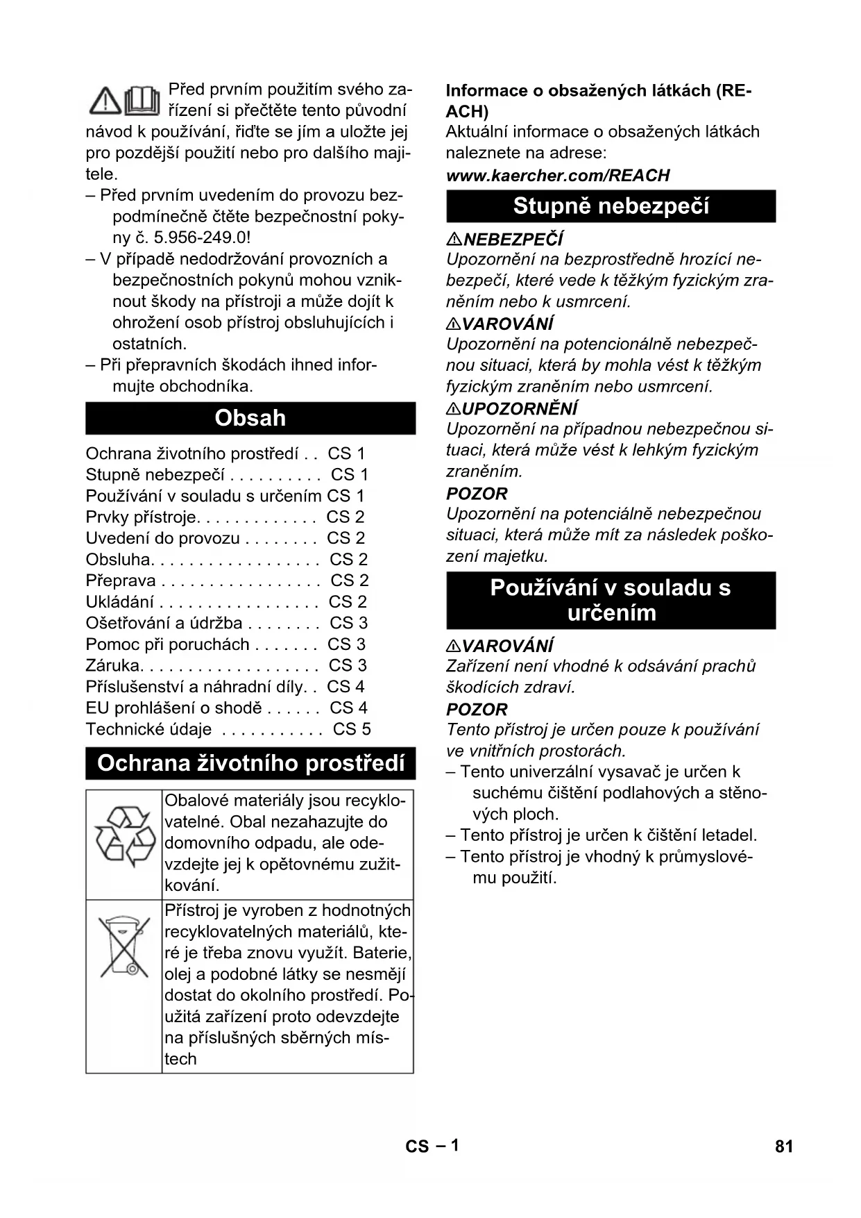 dB(A) 78 Névleges teljesítményfelvétel W 900 Hálózati ká- bel SJT 2x16 AWG (105 °C) Alkatrész szám Kábelhos- szúság 6.650-589.0 25 m 80 HU– 1 Před prvním použitím svého za- řízení si přečtěte tento původní návod k používání, řiďte se jím a uložte jej pro pozdější použití nebo pro dalšího maji- tele. – Před prvním uvedením do provozu bez- podmínečně čtěte bezpečnostní poky- ny č. 5.956-249.0! – V případě nedodržování provozních a bezpečnostních pokynů mohou vznik- nout škody na přístroji a může dojít k ohrožení osob přístroj obsluhujících i ostatních. – Při přepravních škodách ihned infor- mujte obchodníka. Informace o obsažených látkách (RE- ACH) Aktuální informace o obsažených látkách naleznete na adrese: www.kaercher.com/REACH NEBEZPEČÍ Upozornění na bezprostředně hrozící ne- bezpečí, které vede k těžkým fyzickým zra- něním nebo k usmrcení. 몇 VAROVÁNÍ Upozornění na potencionálně nebezpeč- nou situaci, která by mohla vést k těžkým fyzickým zraněním nebo usmrcení. 몇 UPOZORNĚNÍ Upozornění na případnou nebezpečnou si- tuaci, která může vést k lehkým fyzickým zraněním. POZOR Upozornění na potenciálně nebezpečnou situaci, která může mít za následek poško- zení majetku. 몇 VAROVÁNÍ Zařízení není vhodné k odsávání prachů škodících zdraví. POZOR Tento přístroj je určen pouze k používání ve vnitř ních prostorách. – Tento univerzální vysavač je určen k suchému čištění podlahových a stěno- vých ploch. – Tento přístroj je určen k čištění letadel. – Tento přístroj je vhodný k průmyslové- mu použití. Obsah Ochrana životního prostředí . . CS 1 Stupně nebezpečí . . . . . . . . . . CS 1 Používání v souladu s určením CS 1 Prvky přístroje. . . . . . . . . . . . . CS 2 Uvedení do provozu . . . . . . . . CS 2 Obsluha. . . . . . . . . . . . . . . . . . CS 2 Přeprava . . . . . . . . . . . . . . . . . CS 2 Ukládání . . . . . . . . . . . . . . . . . CS 2 Ošetřování a údržba . . . . . . . . CS 3 Pomoc při poruchách . . . . . . . CS 3 Záruka. . . . . . . . . . . . . . . . . . . CS 3 Příslušenství a náhradní díly. . CS 4 EU prohlášení o shodě . . . . . . CS 4 Technické údaje . . . . . . . . . . . CS 5 Ochrana životního prostředí Obalové materiály jsou recyklo- vatelné. Obal nezahazujte do domovního odpadu, ale ode- vzdejte jej k opětovnému zužit- kování. Přístroj je vyroben z hodnotných recyklovatelných materiálů, kte- ré je třeba znovu využít. Baterie, olej a podobné látky se nesmějí dostat do okolního prostředí. Po- užitá zařízení proto odevzdejte na příslušných sběrných mís- tech Stupně nebezpečí Používání v souladu s určením 81CS– 2 1 Filtrační sáček z netkané textilie 2 Sací hrdlo 3 Sací hadice 4 typový štítek 5 Kabelový hák 6 Držadlo 7 Sít'ový kabel 8 Vysávací hlavice 9 Uzamčení sací hlavy 10 Řídicí válec 11 Nádoba na nečistoty 12 Hlavní spínač 13 Přepínání pevná podlaha/koberce 14 Hubice na čištění podlah 15 Sací hubice 16 Upevnění zástrčky do sítě 17 Vybrání na podlahovou hubici 18 Zajištění krytu 19 Kryt 20 Regulátor sací síly (plynule regulovatel- né) 21 Násadka 22 Těleso filtru 23 Filtr odváděného vzduchu 24 Hlavní filtrační koš 25 Ochranný filtr motoru 26 Mřížka ochranného filtru motoru – Obslužné prvky čisticího procesu jsou žluté. – Obslužné prvky údržby a servisních oprav jsou světle šedé. Zkontrolujte, zda je hlavní filtrační koš nasazen v zařízení. 1 Provoz s filtračním sáčkem z netkané textilie nebo z papíru (zvláštní příslu- šenství) 2 Provoz bez filtračního sáčku Odjistěte vysávací hlavici a sejměte ji. Vyjměte hlavní filtrační koš. Nasaďte filtrační sáček z netkané texti- lie nebo z papíru (zvláštní příslušenství). Nasaďte hlavní filtrační koš. Nasaďte vysávací hlavici a zajistěte ji. Zasuňte sít'ovou zástrčku do zásuvky. Zapněte přístroj hlavním spínačem. Přepínání podlahové hubice nastavte na pevnou podlahu nebo koberec. Regulujte sací sílu pomocí příslušného regulátoru (plynule nastavitelného) Provést čištění. Vypněte přístroj hlavním spínačem. Vytáhněte zástrčku ze sítě. Nádobu vyprázdněte Přístroj odsajte a utřete uvnitř i vně vlh- kým hadrem. 몇 UPOZORNĚNÍ Nebezpečí úrazu a nebezpečí poškození! Dbejte na hmotnost přístroje při přepravě. Při přepravě v dopravních prostředcích zajistěte zařízení proti skluzu a překlo- pení podle platných předpisů. 몇 UPOZORNĚNÍ Nebezpečí úrazu a nebezpečí poškození! Dbejte na hmotnost přístroje při jeho uskladnění. Toto zařízení smí být uskladněno pouze v uzavřených prostorách. Prvky přístroje Barevné označení Uvedení do provozu Provozní režimy Montáž filtračního sáčku Obsluha Zapnutí přístroje Čisticí provoz Vypnutí zařízení Po každém použití Přeprava Ukládání 82 CS– 3 NEBEZPEČÍ Před každou prací na zařízení vždy zaříze- ní vypněte a vytáhněte síťovou zástrčku. Hlavní filtrační koš (omyvatelný) dle po- třeby očistěte pod tekoucí vodou. POZOR Nebezpečí poškození! Hlavní filtrační koš nenasazujte nikdy mokrý. Filtr odváděného vzduchu: vyměňujte 1x ročně Odjistěte kryt a sejměte jej. Vyjměte těleso filtru. Filtr odváděného vzduchu vyjměte z pouzdra filtru. Do pouzdra filtru nasaďte nový filtr od- váděného vzduchu. Nasaďte těleso filtru. Nasaďte kryt a zajistěte jej. Odjistěte vysávací hlavici a sejměte ji. Zatlačte mřížku ochranného filtru moto- ru dolů, otočte a vyjměte. Vyjměte ochranný filtr motoru. Vložte nový ochranný filtr motoru. Nasaďte novou mřížku ochranného fil- tru motoru a zaar