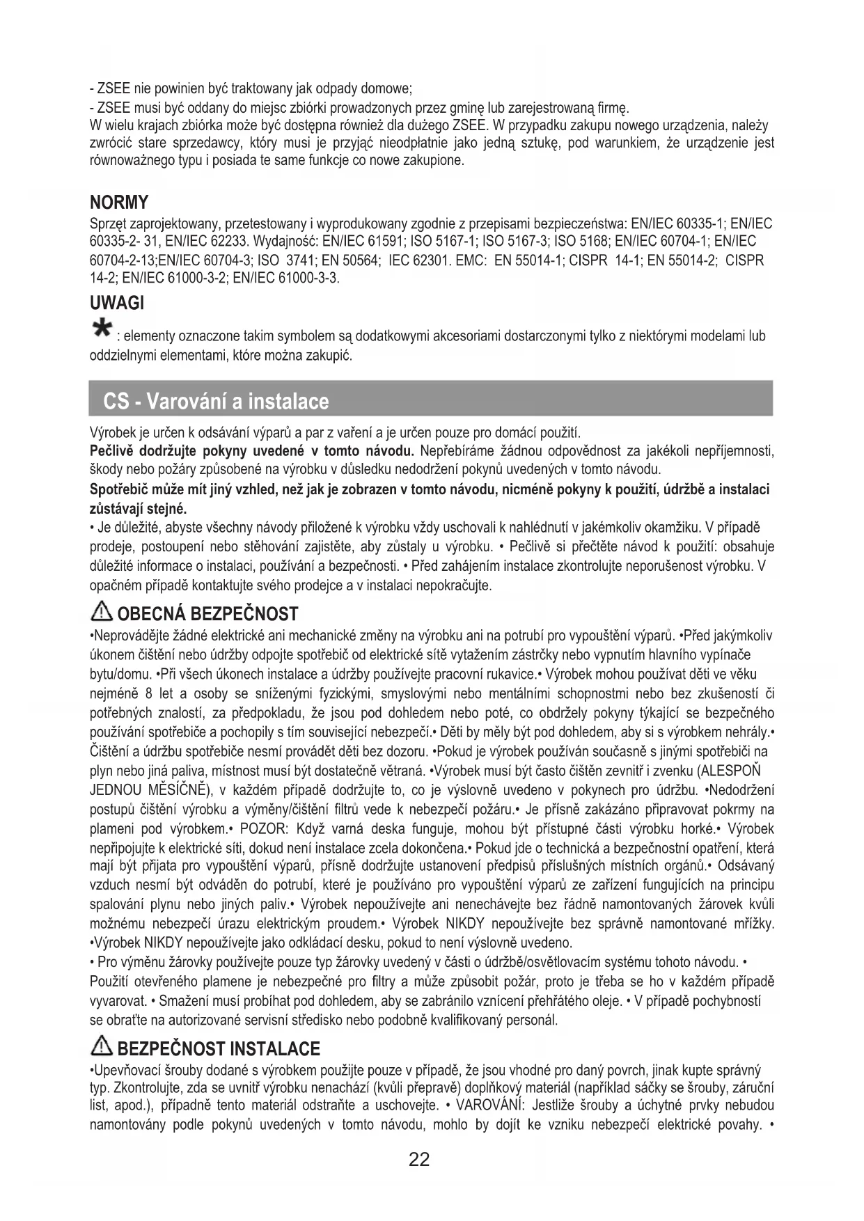 - Neprovádějte žádné elektrické ani mechanické změny na výrobku ani na potrubí pro vypouštění výparů. •Před jakýmkoliv úkonem čištění nebo údržby odpojte spotřebič od elektrické sítě vytažením zástrčky nebo vypnutím hlavního vypínače bytu/domu. •Při všech úkonech instalace a údržby používejte pracovní rukavice.• Výrobek mohou používat děti ve věku nejméně 8 let a osoby se sníženými fyzickými, smyslovými nebo mentálními schopnostmi nebo bez zkušeností či potřebných znalostí, za předpokladu, že jsou pod dohledem nebo poté, co obdržely pokyny týkající se bezpečného používání spotřebiče a pochopily s tím související nebezpečí.• Děti by měly být pod dohledem, aby si s výrobkem nehrály.• Čištění a údržbu spotřebiče nesmí provádět děti bez dozoru. •Pokud je výrobek používán současně s jinými spotřebiči na plyn nebo jiná paliva, místnost musí být dostatečně větraná. •Výrobek musí být často čištěn zevnitř i zvenku (ALESPOŇ JEDNOU MĚSÍČNĚ), v každém případě dodržujte to, co je výslovně uvedeno v pokynech pro údržbu. •Nedodržení postupů čištění výrobku a výměny/čištění filtrů vede k nebezpečí požáru.• Je přísně zakázáno připravovat pokrmy na plameni pod výrobkem.• POZOR: Když varná deska funguje, mohou být přístupné části výrobku horké.• Výrobek nepřipojujte k elektrické síti, dokud není instalace zcela dokončena.• Pokud jde o technická a bezpečnostní opatření, která mají být přijata pro vypouštění výparů, přísně dodržujte ustanovení předpisů příslušných místních orgánů.• Odsávaný vzduch nesmí být odváděn do potrubí, které je používáno pro vypouštění výparů ze zařízení fungujících na principu spalování plynu nebo jiných paliv.• Výrobek nepoužívejte ani nenechávejte bez řádně namontovaných žárovek kvůli možnému nebezpečí úrazu elektrickým proudem.• Výrobek NIKDY nepoužívejte bez správně namontované mřížky.