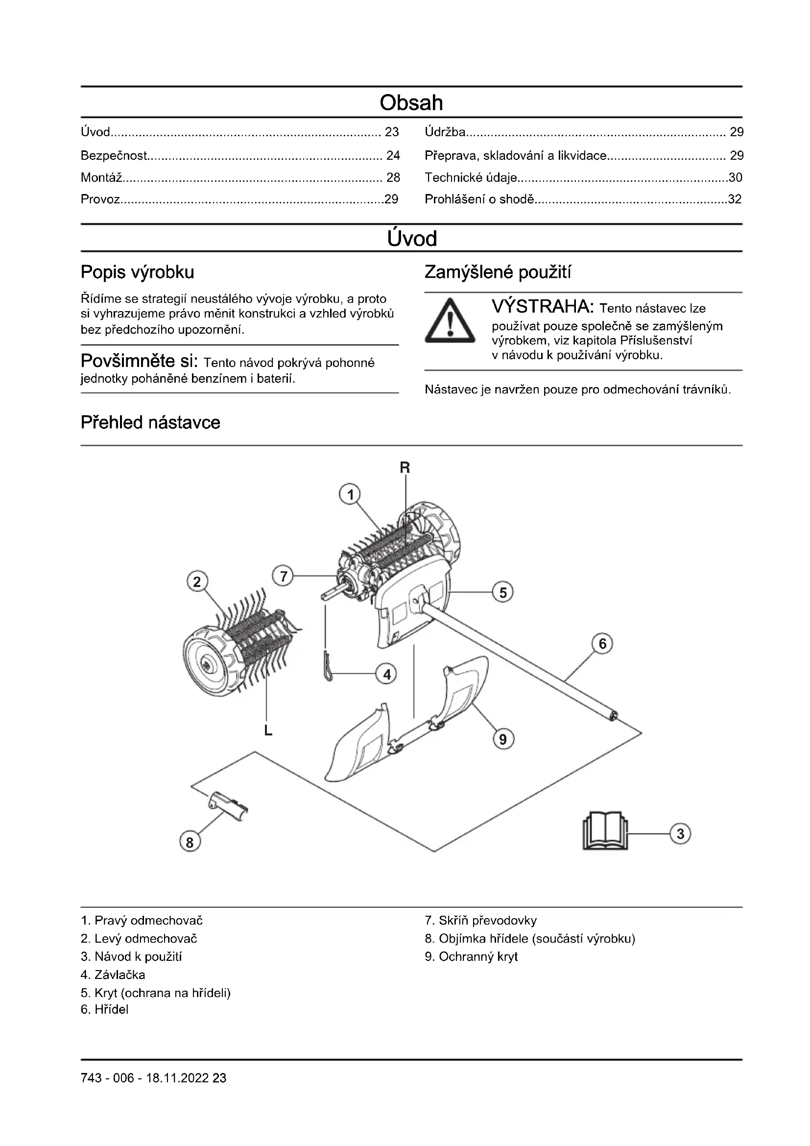 ana štítku. Povšimněte si: Další symboly/štítky na nástavci se týkají zvláštních certifikačních požadavků pro určité obchodní trhy. Bezpečnost Definice týkající se bezpečnosti Varování, upozornění apoznámky slouží jako upozornění na specifické důležité části návodu kpoužívání. VÝSTRAHA: Používá se vpřípadě nebezpečí úrazu nebo usmrcení obsluhy nebo okolních osob, pokud nejsou dodrženy pokyny uvedené vtéto příručce. VAROVÁNÍ: Používá se vpřípadě nebezpečí poškození výrobku nebo nástavce, dalších materiálů či škod na majetku vblízkém okolí, pokud nejsou dodrženy pokyny uvedené vtéto příručce. Povšimněte si: Používá se kposkytnutí dalších informací, které jsou nezbytné vdané situaci. 24 743 - 006 - 18.11.2022Obecné bezpečnostní pokyny VÝSTRAHA: Před použitím nástavce si přečtěte následující bezpečnostní pokyny.