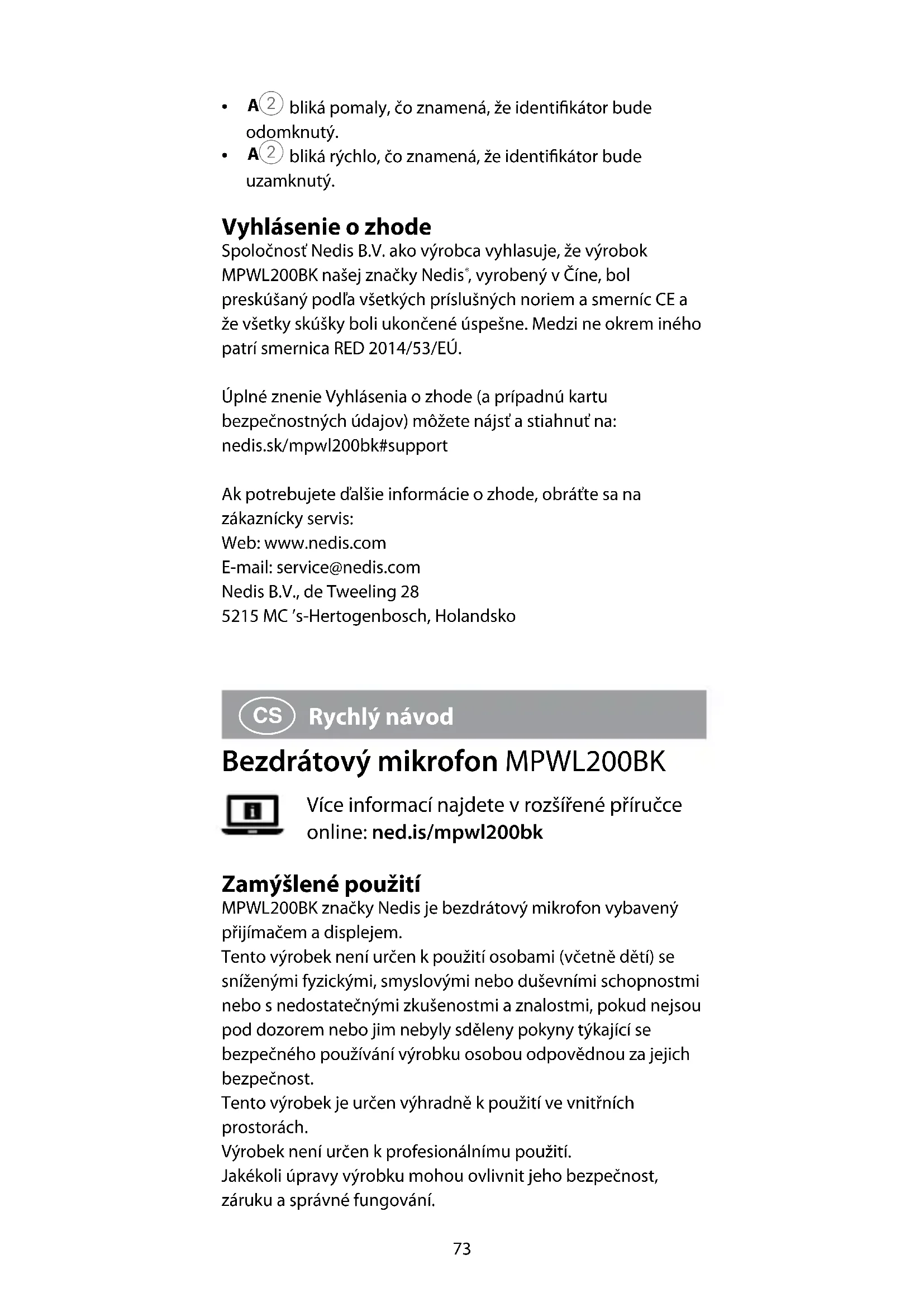 , vyrobený v Číně, byl přezkoušen v souladu se všemi relevantními normami a nařízeními EK a že všemi zkouškami úspěšně prošel. Patří sem mimo jiné také nařízení RED 2014/53/EU. Kompletní prohlášení o shodě (a případně bezpečnostní list) můžete najít a stáhnout na adrese: nedis.cs/mpwl200bk#support Další informace týkající se shody s předpisy získáte u oddělení služeb zákazníkům: Web: www.nedis.com E-mail: service@nedis.com Nedis B.V., de Tweeling 28 5215 MC ’s-Hertogenbosch, Nizozemsko78