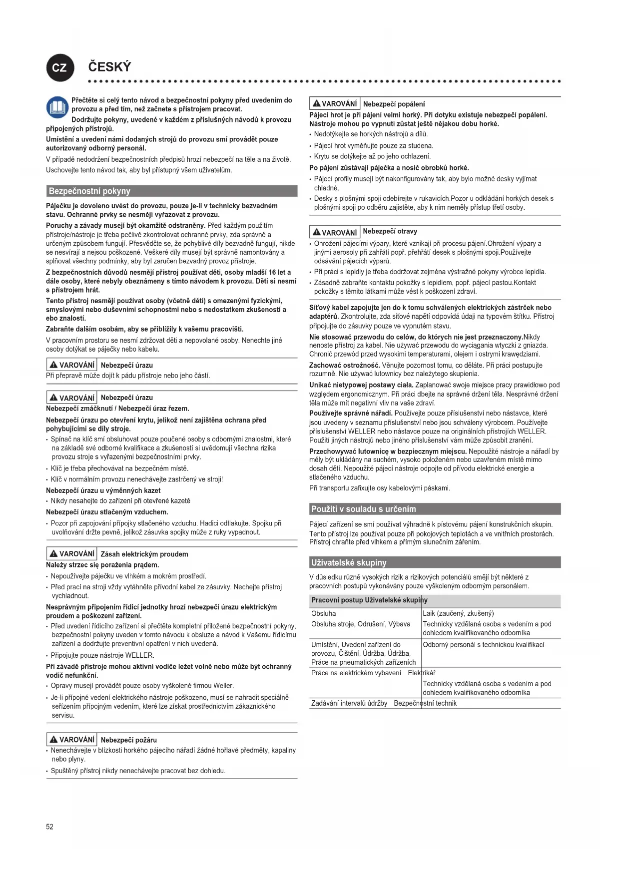 - Zásadnězabraňtekontaktupokožkyslepidlem,popř.pájecípastou.Kontakt pokožkystěmitolátkamimůževéstkpoškozenízdraví. Síťový kabel zapojujte jen do k tomu schválených elektrických zástrček nebo adaptér. Zkontrolujte, zda síťové napětí odpovídá údaji na typovém štítku. Přístroj připojujte do zásuvky pouze ve vypnutém stavu. Nie stosować przewodu do celów, do których nie jest przeznaczony.Nikdy nenostepřístrojzakabel.Nieużywaćprzewodudowyciąganiawtyczkizgniazda. Chronićprzewódprzedwysokimitemperaturami,olejemiostrymikrawędziami. Zachować ostrożność. Věnujtepozornosttomu,coděláte.Připrácipostupujte rozumně.Nieużywaćlutownicybeznależytegoskupienia. Unikać nietypowej postawy ciała. Zaplanowaćswojemiejscepracyprawidłowopod względemergonomicznym.Připrácidbejtenasprávnédrženítěla.Nesprávnédržení tělamůžemítnegativnívlivnavašezdraví. Používejte správné nářadí. Používejtepouzepříslušenstvínebonástavce,které jsouuvedenyvseznamupříslušenstvínebojsouschválenyvýrobcem.Používejte příslušenstvíWELLERnebonástavcepouzenaoriginálníchpřístrojíchWELLER. Použitíjinýchnástrojůnebojinéhopříslušenstvívámmůžezpůsobitzranění. Przechowywać lutownicę w bezpiecznym miejscu.Nepoužiténástrojeanářadíby mělybýtukládánynasuchém,vysokopoloženémnebouzavřenémmístěmimo dosahdětí.Nepoužitépájecínástrojeodpojteodpřívoduelektrickéenergiea stlačenéhovzduchu. Přitransportuzaxujteosykabelovýmipáskami. Použití v souladu s určením Pájecízařízenísesmípoužívatvýhradněkpístovémupájeníkonstrukčníchskupin. Tentopřístrojlzepoužívatpouzepřipokojovýchteplotáchavevnitřníchprostorách. Přístrojchraňtepředvlhkemapřímýmslunečnímzářením. Uživatelské skupiny Vdůsledkurůzněvysokýchrizikarizikovýchpotenciálůsmějíbýtněkteréz pracovníchpostupůvykonáványpouzevyškolenýmodbornýmpersonálem. Pracovní postup Uživatelské skupiny Obsluha Obsluhastroje,Odrušení,Výbava Laik(zaučený,zkušený) Technickyvzdělanáosobasvedenímapod dohledemkvalikovanéhoodborníka Umístění,Uvedenízařízenído provozu,Čištění,Údržba,Údržba, Prácenapneumatickýchzařízeních Odbornýpersonálstechnickoukvalikací Prácenaelektrickémvybavení Elektrikář Technickyvzdělanáosobasvedenímapod dohledemkvalikovanéhoodborníka Zadáváníintervalůúdržby Bezpečnostnítechnik