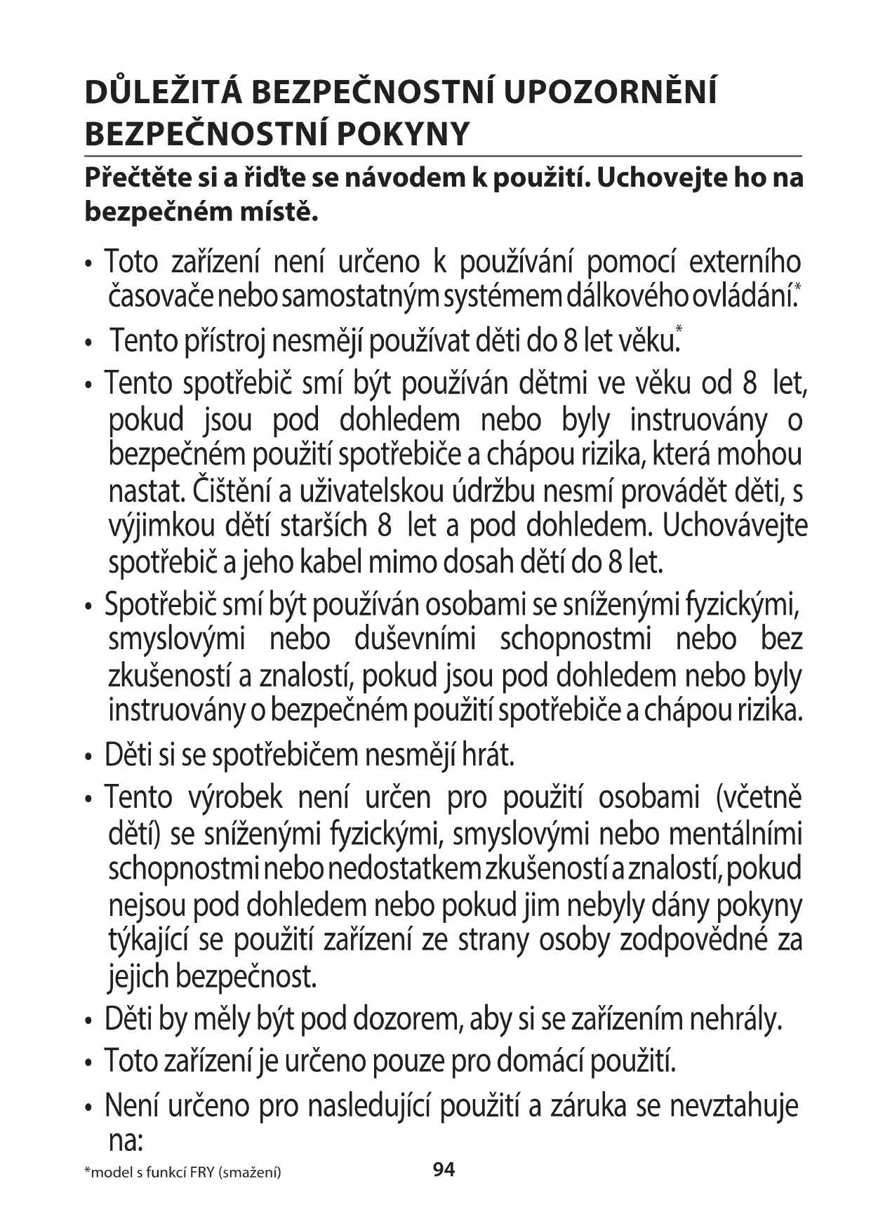 - Není určeno pro nasledující použití a záruka se nevztahuje na: *model s funkcí FRY(smažení)95