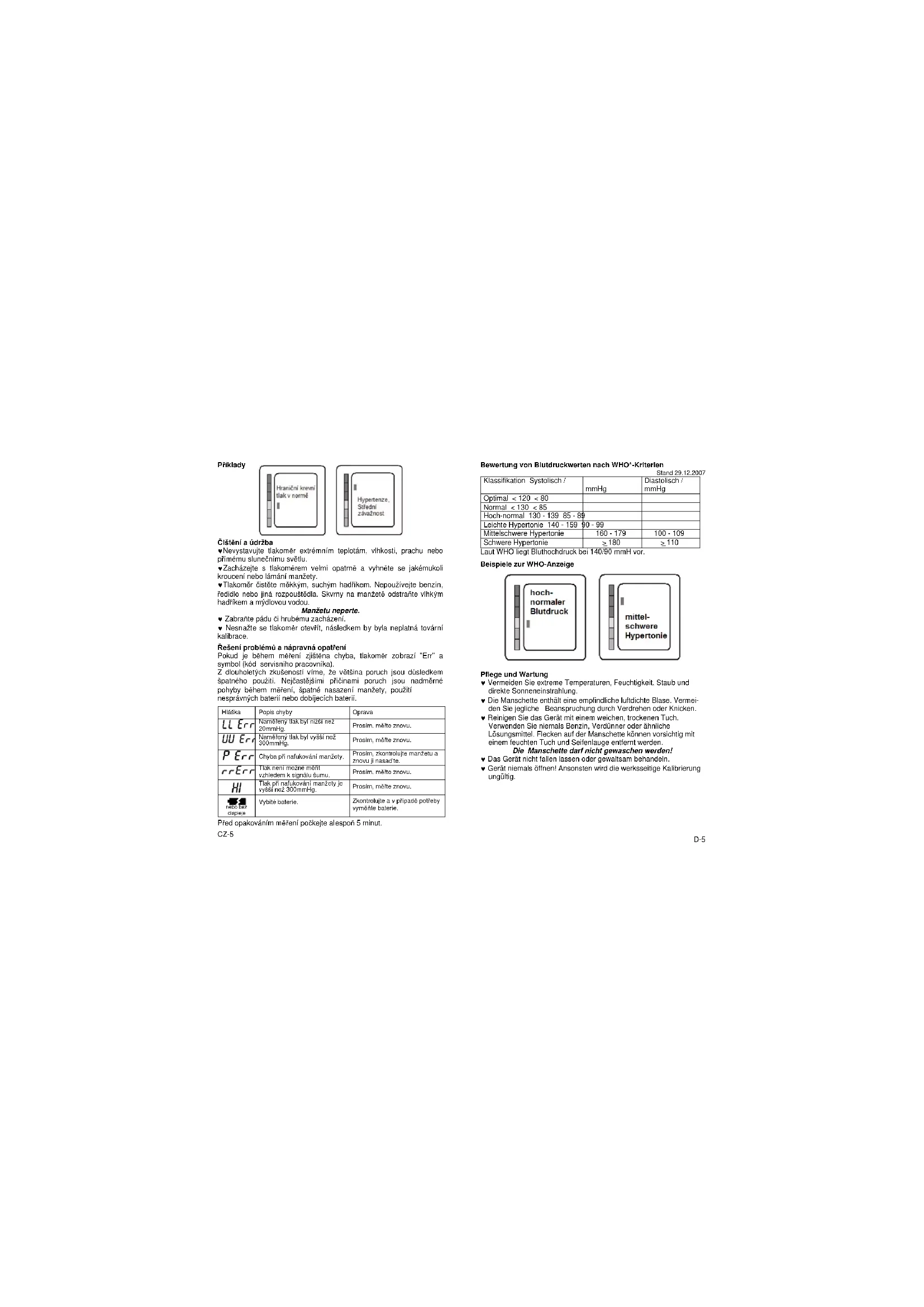 Čištění a údržba ♥Nevystavujte tlakoměr extrémním teplotám, vlhkosti, prachu nebo přímému slunečnímu světlu. ♥Zacházejte s tlakoměrem velmi opatrně a vyhněte se jakémukoli kroucení nebo lámání manžety. ♥Tlakoměr čistěte měkkým, suchým hadříkem. Nepoužívejte benzín, ředidlo nebo jiná rozpouštědla. Skvrny na manžetě odstraňte vlhkým hadříkem a mýdlovou vodou. Manžetu neperte. ♥ Zabraňte pádu či hrubému zacházení. ♥ Nesnažte se tlakoměr otevřít, následkem by byla neplatná tovární kalibrace. Řešení problémů a nápravná opatření Pokud je během měření zjištěna chyba, tlakoměr zobrazí "Err" a symbol (kód servisního pracovníka). Z dlouholetých zkušeností víme, že většina poruch jsou důsledkem špatného použití. Nejčastějšími příčinami poruch jsou nadměrné pohyby během měření, špatné nasazení manžety, použití nesprávných baterií nebo dobíjecích baterií.