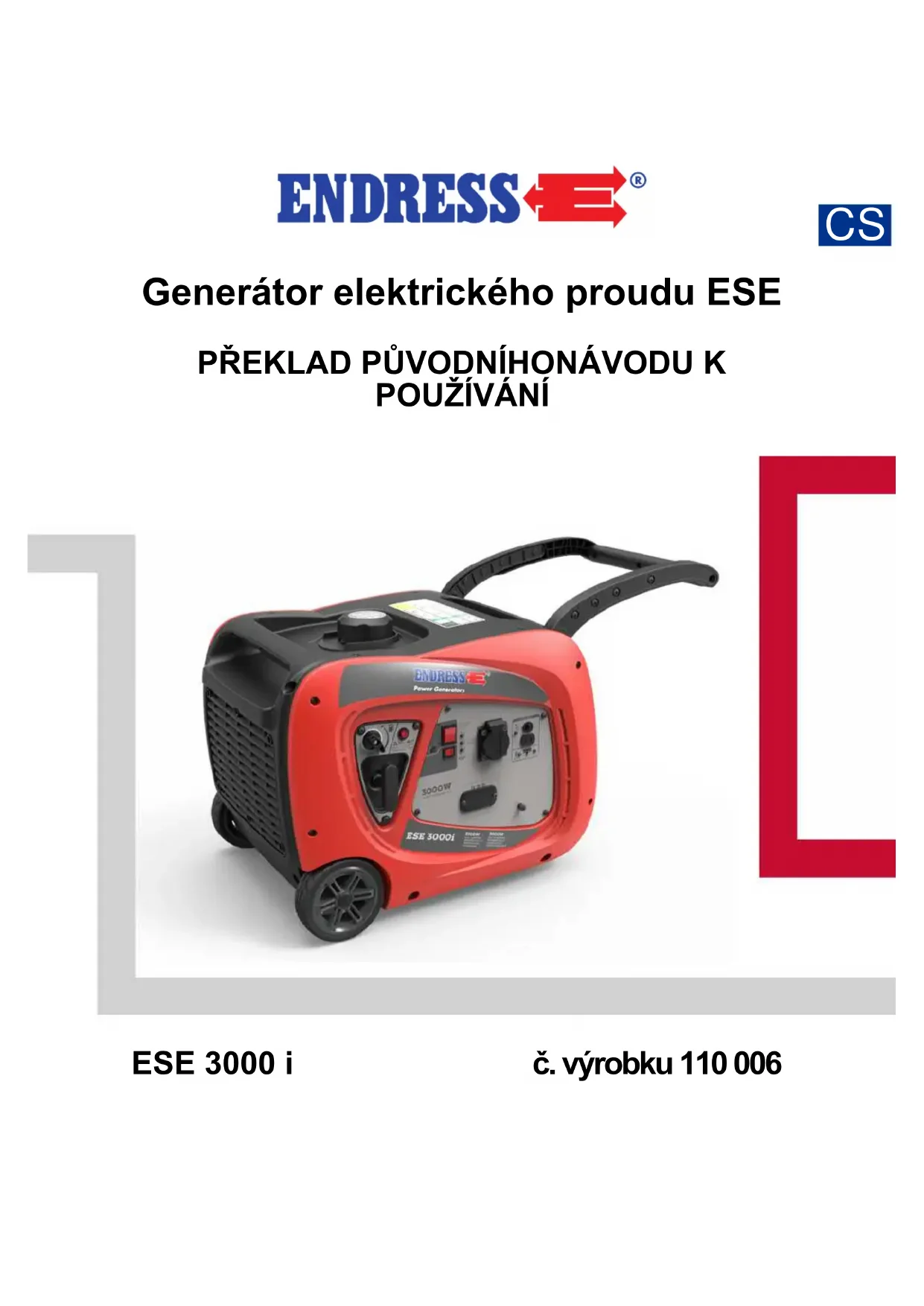 - ESE 3000 i č. výrobku 110 006 CS2 Výrobce ENDRESS Elektrogerätebau GmbH Neckartenzlinger Str. 39 D-72658 Bempflingen Telefon: + 49 (0) 71 23 / 9737 - 0 Telefax: + 49 (0) 71 23 / 9737 - 50 E-mail: info@endress-stromerzeuger.de www: http://www.endress-stromerzeuger.de Číslo / verze doku- mentu E136085 / i03 Datum vydání Leden 2019 Copyright 2019 ENDRESS Elektrogerätebau GmbH Tato dokumentace včetně všech svých součástí je chráněna autorským právem. Jakékoli využití, popř. změna mimo úzkých mezí zákona o autorských právech není bez souhlasu firmy ENDRESS Elektrogerätebau GmbH dovolená a je trest- ná. To platí obzvláště pro rozmnožování, překládání, fotografování na mikrofilm a ukládání a zpracování v elektronických systémech. Upozornění týkající se předání k tisku Všechny popisy, technické údaje a vyobrazení se vztahují k provedení generáto- ru elektrického proudu v době předání návodu k tisku. Zásadně si vyhrazujeme právo na změny ve smyslu dalšího technického vývoje. Technické změny po vydání tohoto návodu k obsluze tiskem nejsou zohledněny. Podání barev v tomto návodu se může, z technických důvodů souvisejících s tis- kem, v jednotlivých případech lišit od skutečného stavu. CS3 Obsah 1Seznamy p. 5