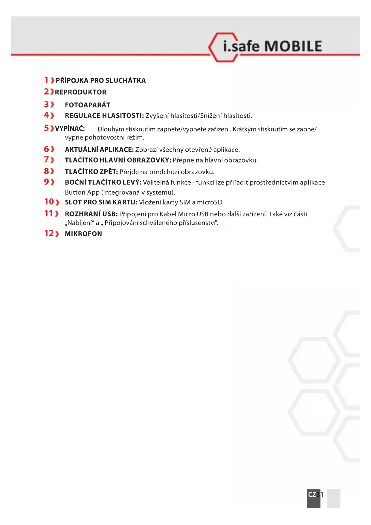 - štítky na zařízení již nejsou čitelné. POUŽITÍ MIMO PROSTŘEDÍ S NEBEZPEČÍM VÝBUCHU NEBEZPEČÍ Nesprávné použití může vyústit ve smrtelný úraz nebo vážná poranění! Nepoužívejte zařízení v místech, kde je jeho používání zakázané. Na klinikách či v lékařských zařízeních zařízení vypínejte. Mezi zařízením a kardiostimulátorem nebo naslouchátkem vždy udržujte bezpečnou vzdále- nost alespoň 15cm. Zařízení může ovlivnit funkčnost lékařských zařízení, jako jsou například kardiostimulátory a naslouchátka. Pokud zařízení používáte při řízení motorového vozidla, ujistěte se, že dodržujete všechny místní zákony. Ujistěte se, že předcházíte všem chybám, které jsou popsány v části „Možné chyby na straně uživatele“. Zařízení nabíjejte pouze způsobem popsaným v části „Nabíjení“.CZ 33 UPOZORNĚNÍ Pokud používáte sluchátka nebo náhlavní soupravy na nejvyšší možnou hlasitost, můžete si poškodit sluch. Nejprve nastavte hlasitost zařízení na 50% maximální hlasitosti. Hlasitost postupně upravujte. POZNÁMKA Nesprávné použití může zařízení poškodit. Používejte pouze příslušenství schválené společností i.safe MOBILE, jak je popsáno v části
