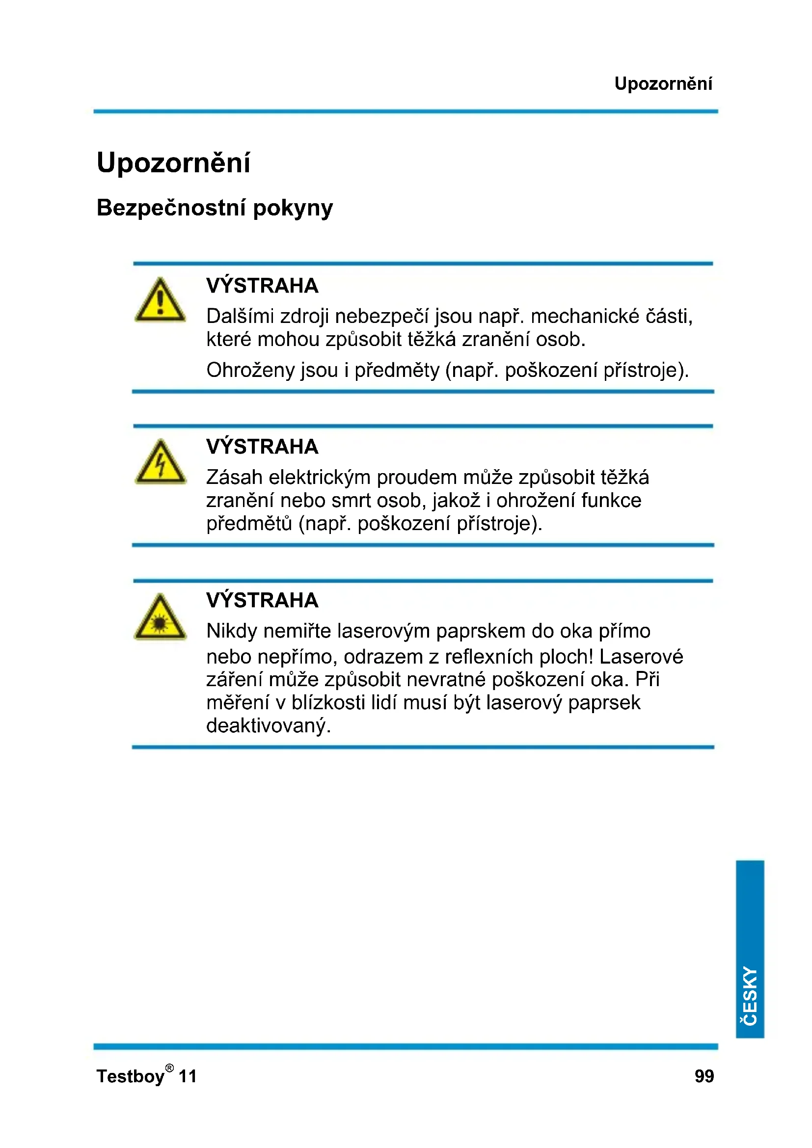VÝSTRAHA Nikdy nemiřte laserovým paprskem do oka přímo nebo nepřímo, odrazem z reflexních ploch! Laserové záření může způsobit nevratné poškození oka. Při měření v blízkosti lidí musí být laserový paprsek deaktivovaný.Upozornění 100 Testboy