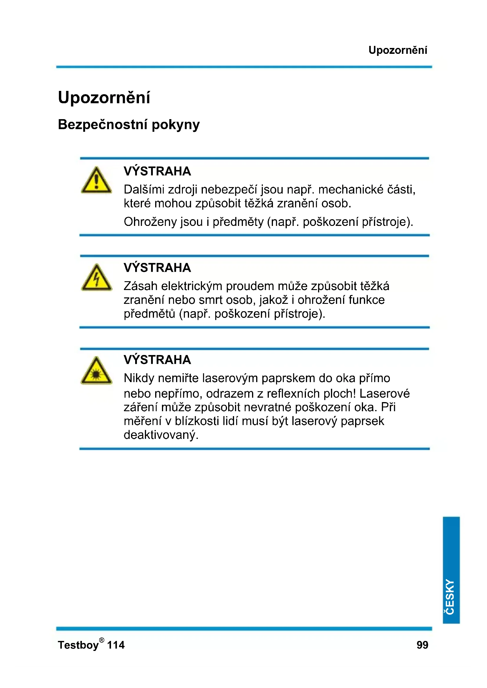 VÝSTRAHA Nikdy nemiřte laserovým paprskem do oka přímo nebo nepřímo, odrazem z reflexních ploch! Laserové záření může způsobit nevratné poškození oka. Při měření v blízkosti lidí musí být laserový paprsek deaktivovaný.Upozornění 100 Testboy