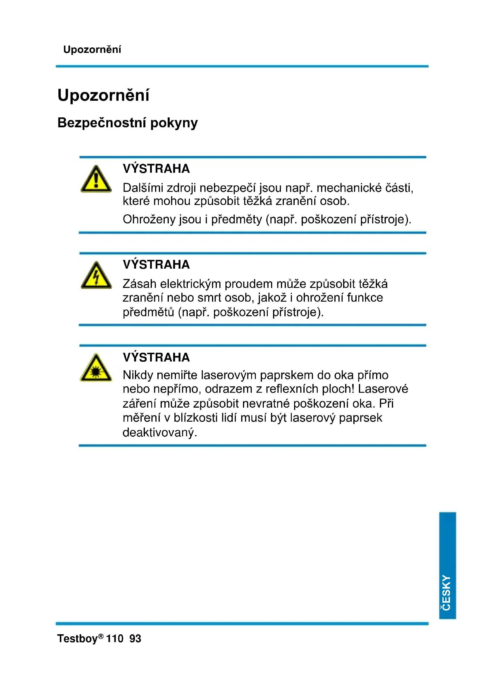 VÝSTRAHA Nikdy nemiřte laserovým paprskem do oka přímo nebo nepřímo, odrazem z reflexních ploch! Laserové záření může způsobit nevratné poškození oka. Při měření v blízkosti lidí musí být laserový paprsek deaktivovaný.Upozornění 94 Testboy