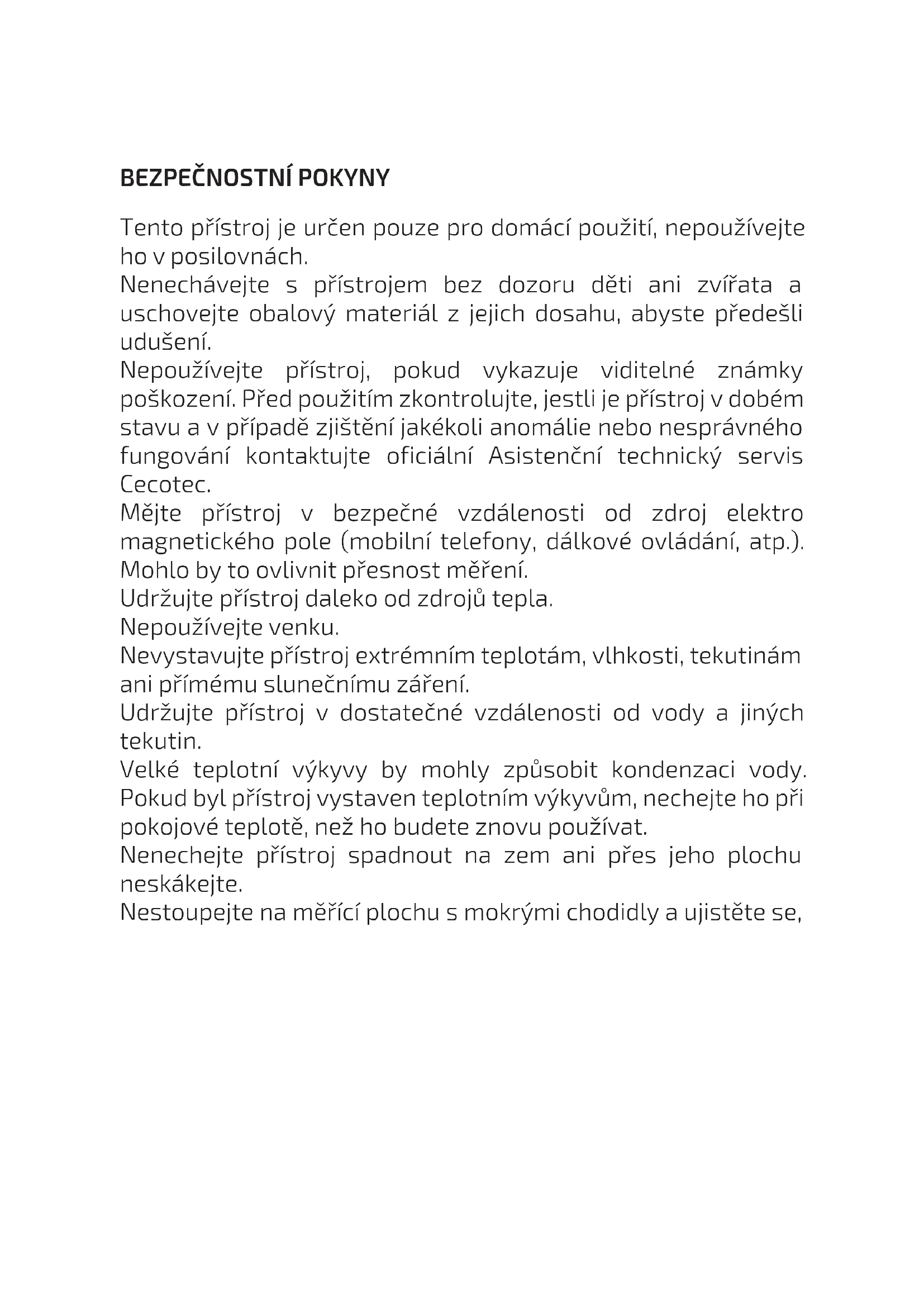 Vyjměte přístroj z krabice. Opatrně zkontrolujte, jestli není poškozený. Pokud najdete nějaké viditelné poškození, okamžitě se obraťte na oficiální Technický servis firmy Cecotec. Odstraňte ochranný proužek z přihrádky na baterie, která je umístěná ve spodní části přístroje, abyste je aktivovali. Tento ochranný proužek je umístěn, aby byl zajištěn bezpečný transport. Další informace Měření hmotnosti by se mělo provádět bez oblečení a s bosými chodidly. Doporučuje se vážit se ve stejnou hodinu a za stejných podmínek. Naměřené hodnoty mohou být ovlivněny vážením se bezprostředně po sportování, pokud jste nepřijímali dostatek tekutin nebo jste během dne dostatečně nejedli. Měření tělesného tuku, obsahu vody v těle a svalové hmoty je možné pouze bez obuvi se suchými chodidly. Povrch váhy musí být čistý, aby fungovala správně. 04264_04265_Surface Precision 10600 Smart Healthy Pro Grey_Black_Manual_YV_01200401.indd 6904264_04265_Surface Precision 10600 Smart Healthy Pro Grey_Black_Manual_YV_01200401.indd 69 2/4/20 10:362/4/20 10:36SURFACE PRECISION SMART HEALTHY PRO BEIGE / DARK GREY