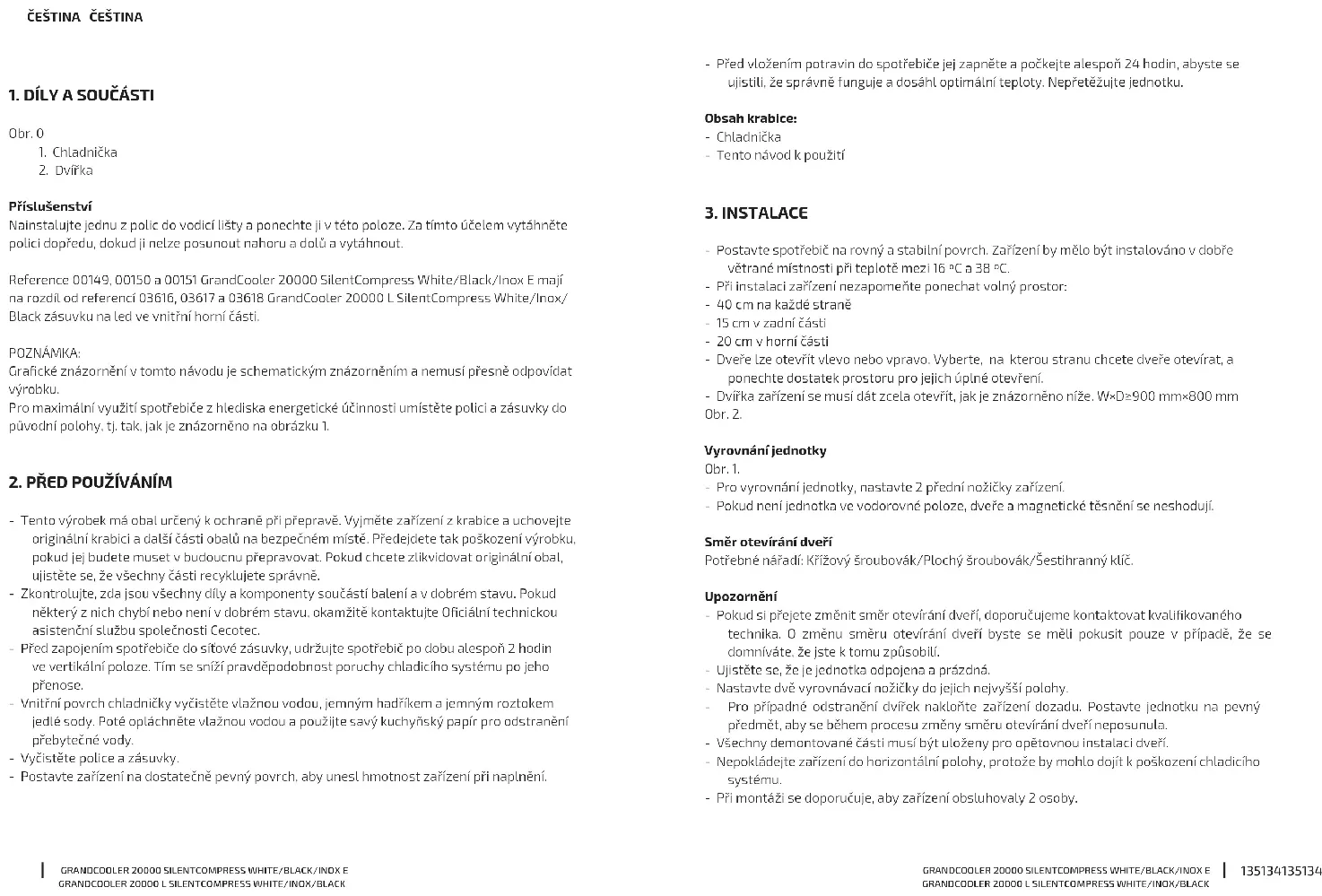 - Postavte spotřebič na rovný a stabilní povrch. Zařízení by mělo být instalováno v dobře větrané místnosti při teplotě mezi 16 ºC a 38 ºC. - Při instalaci zařízení nezapomeňte ponechat volný prostor: - 40 cm na každé straně - 15 cm v zadní části - 20 cm v horní části - Dveře lze otevřít vlevo nebo vpravo. Vyberte, na kterou stranu chcete dveře otevírat, a ponechte dostatek prostoru pro jejich úplné otevření. - Dvířka zařízení se musí dát zcela otevřít, jak je znázorněno níže. W×D≥900 mm×800 mm Obr. 2. Vyrovnání jednotky Obr. 1. - Pro vyrovnání jednotky, nastavte 2 přední nožičky zařízení. - Pokud není jednotka ve vodorovné poloze, dveře a magnetické těsnění se neshodují. Směr otevírání dveří Potřebné nářadí: Křížový šroubovák/Plochý šroubovák/Šestihranný klíč. Upozornění - Pokud si přejete změnit směr otevírání dveří, doporučujeme kontaktovat kvalikovaného technika. O změnu směru otevírání dveří byste se měli pokusit pouze v případě, že se domníváte, že jste k tomu způsobilí. - Ujistěte se, že je jednotka odpojena a prázdná. - Nastavte dvě vyrovnávací nožičky do jejich nejvyšší polohy. - Pro případné odstranění dvířek nakloňte zařízení dozadu. Postavte jednotku na pevný předmět, aby se během procesu změny směru otevírání dveří neposunula. - Všechny demontované části musí být uloženy pro opětovnou instalaci dveří. - Nepokládejte zařízení do horizontální polohy, protože by mohlo dojít k poškození chladicího systému. - Při montáži se doporučuje, aby zařízení obsluhovaly 2 osoby.GRANDCOOLER 20000 SILENTCOMPRESS WHITE/BLACK/INOX E