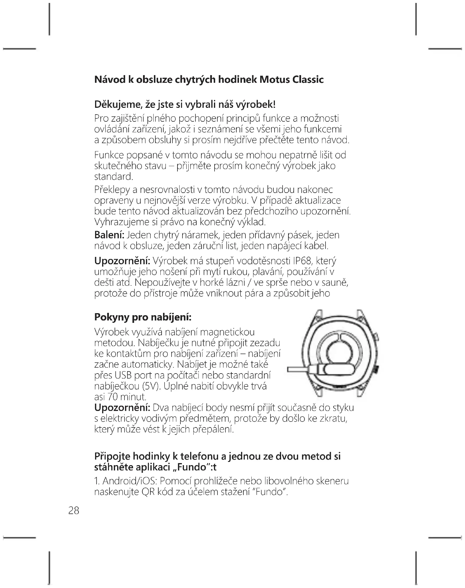 HU28 Návod k obsluze chytrých hodinek Motus Classic Děkujeme, že jste si vybrali náš výrobek! Pro zajištění plného pochopení principů funkce a možnosti ovládání zařízení, jakož i seznámení se všemi jeho funkcemi a způsobem obsluhy si prosím nejdříve přečtěte tento návod. Funkce popsané v tomto návodu se mohou nepatrně lišit od skutečného stavu – přijměte prosím konečný výrobek jako standard. Překlepy a nesrovnalosti v tomto návodu budou nakonec opraveny u nejnovější verze výrobku. V případě aktualizace bude tento návod aktualizován bez předchozího upozornění. Vyhrazujeme si právo na konečný výklad. Balení: Jeden chytrý náramek, jeden přídavný pásek, jeden návod k obsluze, jeden záruční list, jeden napájecí kabel. Upozornění: Výrobek má stupeň vodotěsnosti IP68, který umožňuje jeho nošení při mytí rukou, plavání, používání v dešti atd. Nepoužívejte v horké lázni / ve sprše nebo v sauně, protože do přístroje může vniknout pára a způsobit jeho Pokyny pro nabíjení: Výrobek využívá nabíjení magnetickou metodou. Nabíječku je nutné připojit zezadu ke kontaktům pro nabíjení zařízení – nabíjení začne automaticky. Nabíjet je možné také přes USB port na počítači nebo standardní nabíječkou (5V). Úplné nabití obvykle trvá asi 70 minut. Upozornění: Dva nabíjecí body nesmí přijít současně do styku s elektricky vodivým předmětem, protože by došlo ke zkratu, který může vést k jejich přepálení. Připojte hodinky k telefonu a jednou ze dvou metod si stáhněte aplikaci „Fundo”:t
