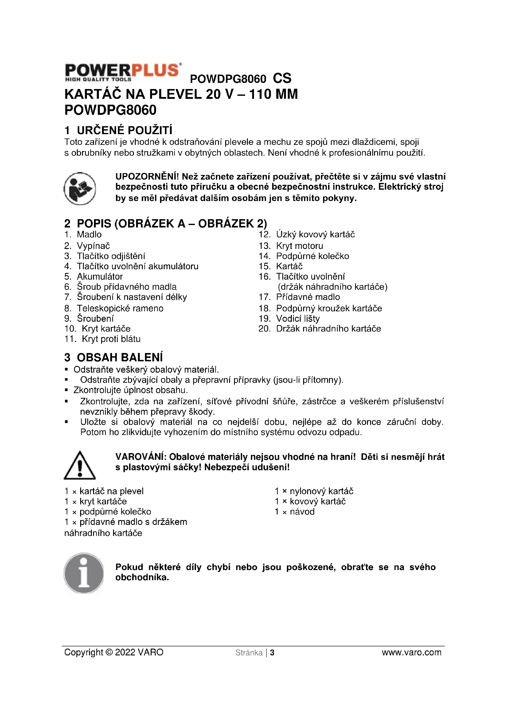 - Při práci s elektrickým strojem se držte mimo dosah dětí a okolostojících osob. Mohou odvést vaši pozornost a ztratíte kontrolu nad strojem.POWDPG8060 CS Copyright © 2022 VARO Stránka | 5 www.varo.com