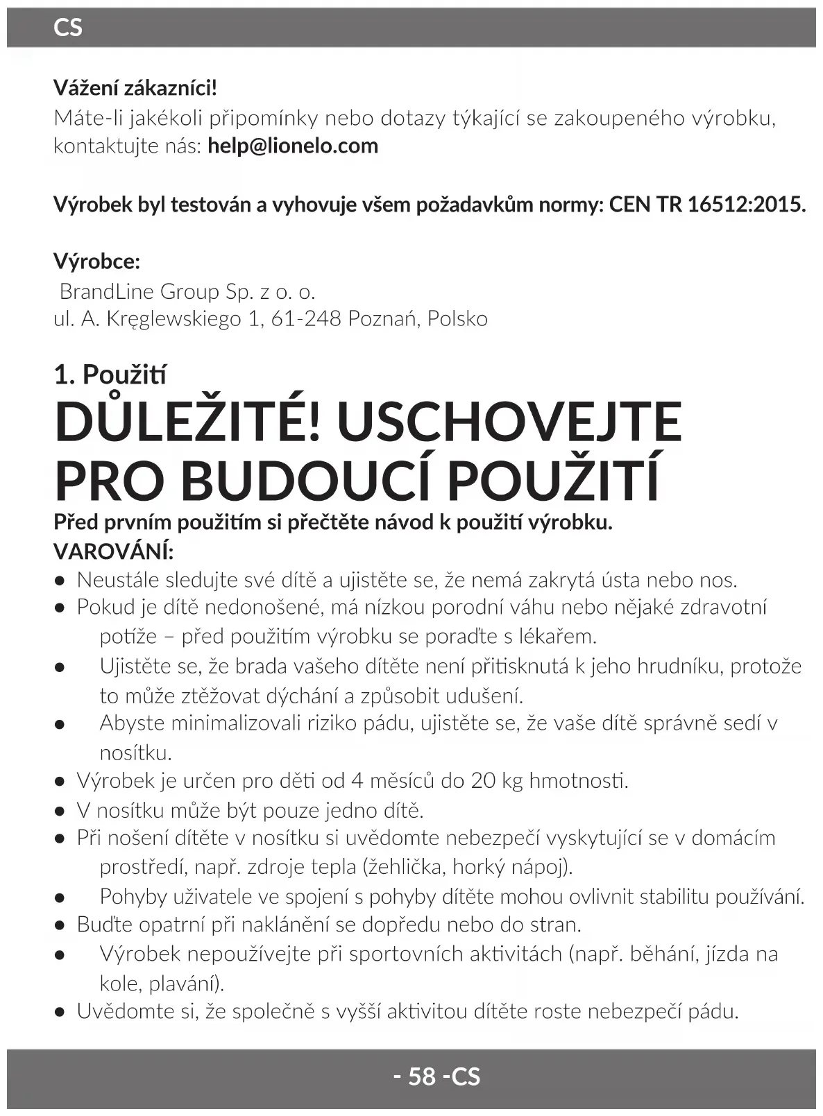 Vážení zákazníci! Máte-li jakékoli připomínky nebo dotazy týkající se zakoupeného výrobku, kontaktujte nás: help@lionelo.com Výrobek byl testován a vyhovuje všem požadavkům normy: CEN TR 16512:2015. Výrobce: BrandLine Group Sp. z o. o. ul. A. Kręglewskiego 1, 61-248 Poznań, Polsko