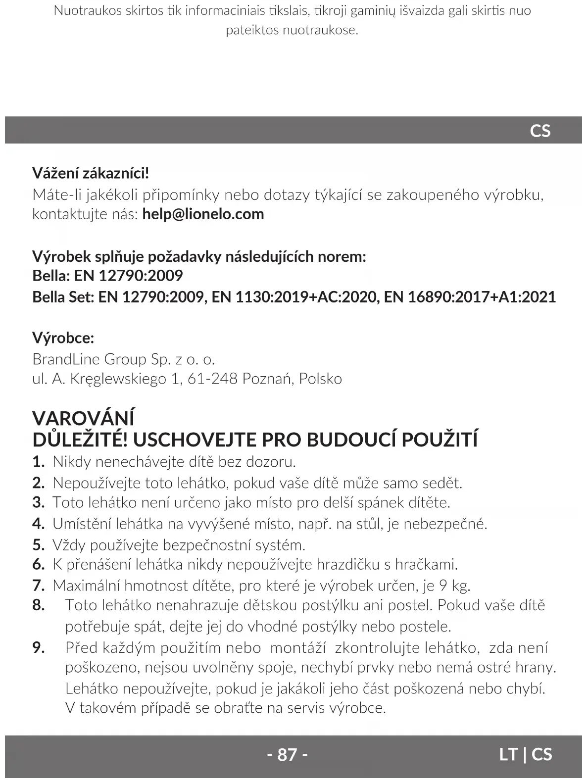 Vážení zákazníci! Máte-li jakékoli připomínky nebo dotazy týkající se zakoupeného výrobku, kontaktujte nás: help@lionelo.com Výrobek splňuje požadavky následujících norem: Bella: EN 12790:2009 Bella Set: EN 12790:2009, EN 1130:2019+AC:2020, EN 16890:2017+A1:2021 Výrobce: BrandLine Group Sp. z o. o. ul. A. Kręglewskiego 1, 61-248 Poznań, Polsko VAROVÁNÍ DŮLEŽITÉ! USCHOVEJTE PRO BUDOUCÍ POUŽITÍ