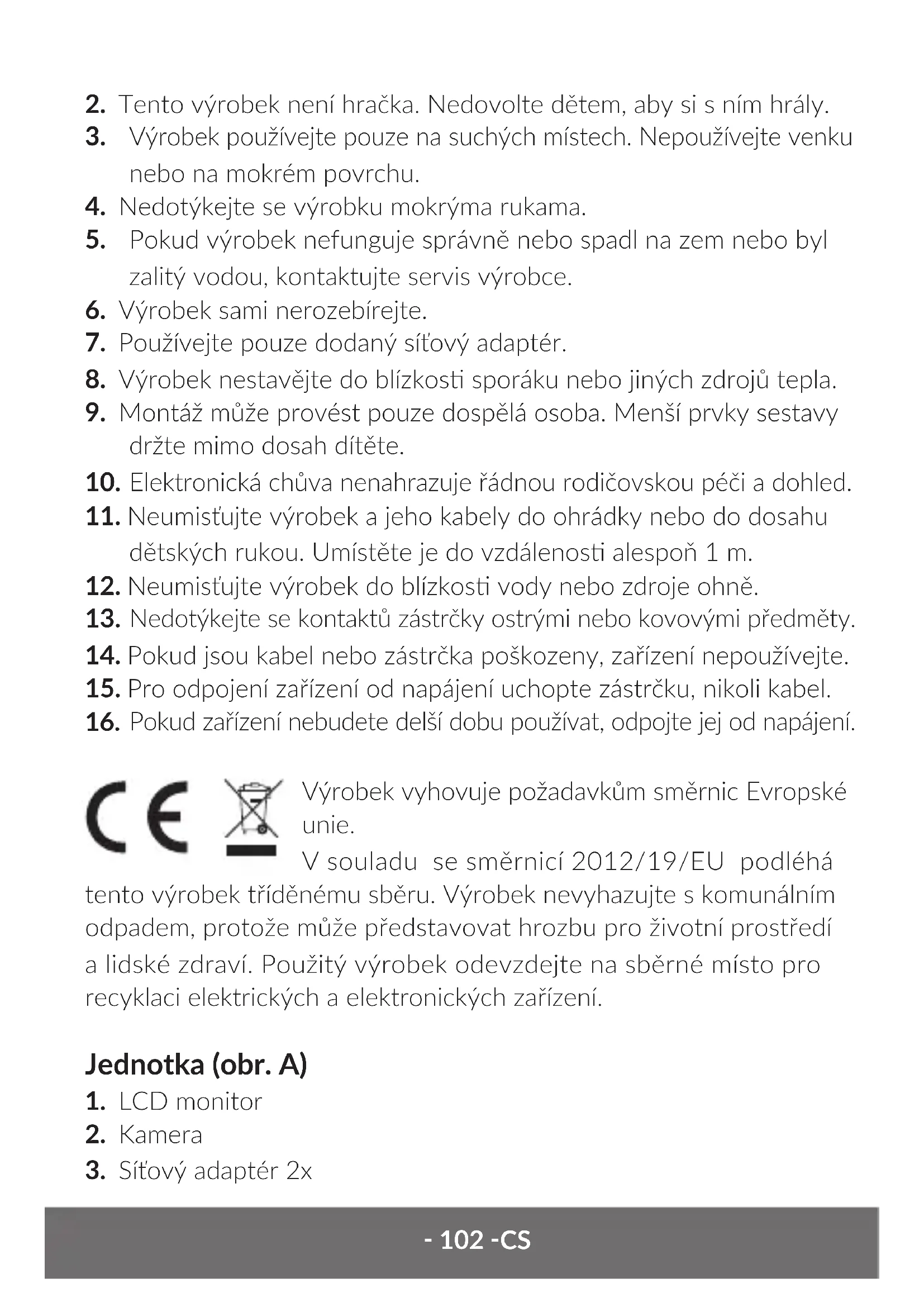 Pokud zařízení nebudete delší dobu používat, odpojte jej od napájení. Výrobek vyhovuje požadavkům směrnic Evropské unie. V souladu se směrnicí 2012/19/EU podléhá tento výrobek tříděnému sběru. Výrobek nevyhazujte s komunálním odpadem, protože může představovat hrozbu pro životní prostředí a lidské zdraví. Použitý výrobek odevzdejte na sběrné místo pro recyklaci elektrických a elektronických zařízení. Jednotka (obr. A)