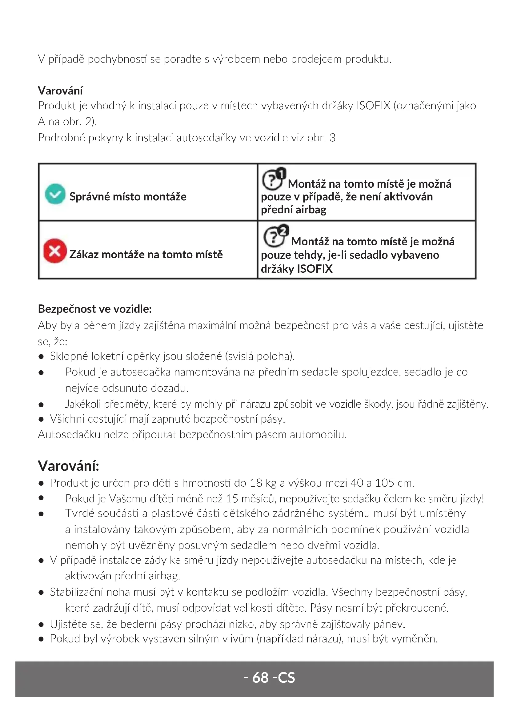 LT | CS‑ 68 ‑CS V případě pochybnos se poraďte s výrobcem nebo prodejcem produktu. Varování Produkt je vhodný k instalaci pouze v místech vybavených držáky ISOFIX (označenými jako A na obr. 2). Podrobné pokyny k instalaci autosedačky ve vozidle viz obr. 3 Správné místo montáže Montáž na tomto místě je možná pouze v případě, že není akvován přední airbag Zákaz montáže na tomto místě Montáž na tomto místě je možná pouze tehdy, je-li sedadlo vybaveno držáky ISOFIX Bezpečnost ve vozidle: Aby byla během jízdy zajištěna maximální možná bezpečnost pro vás a vaše cestující, ujistěte se, že: