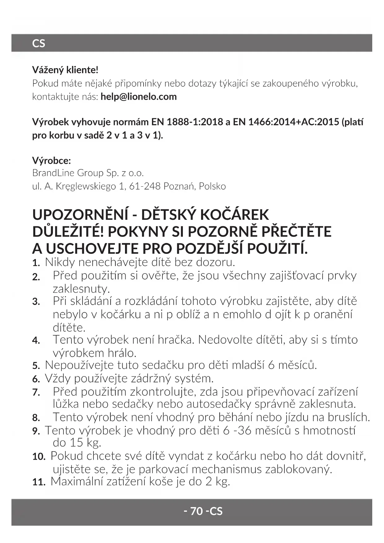 Vážený kliente! Pokud máte nějaké připomínky nebo dotazy týkající se zakoupeného výrobku, kontaktujte nás: help@lionelo.com Výrobek vyhovuje normám EN 1888-1:2018 a EN 1466:2014+AC:2015 (pla pro korbu v sadě 2 v 1 a 3 v 1). Výrobce: BrandLine Group Sp. z o.o. ul. A. Kręglewskiego 1, 61-248 Poznań, Polsko UPOZORNĚNÍ - DĚTSKÝ KOČÁREK DŮLEŽITÉ! POKYNY SI POZORNĚ PŘEČTĚTE A USCHOVEJTE PRO POZDĚJŠÍ POUŽITÍ.