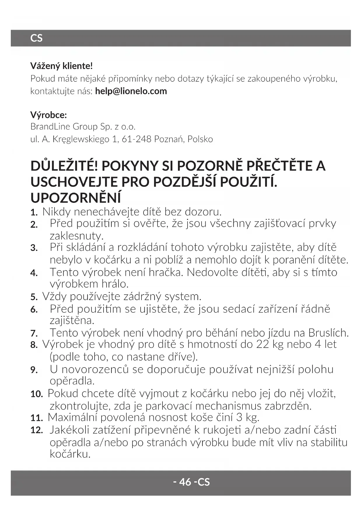 Jakékoli zažení připevněné k rukoje a/nebo zadní čás opěradla a/nebo po stranách výrobku bude mít vliv na stabilitu kočárku. CS‑ 47 ‑ CS