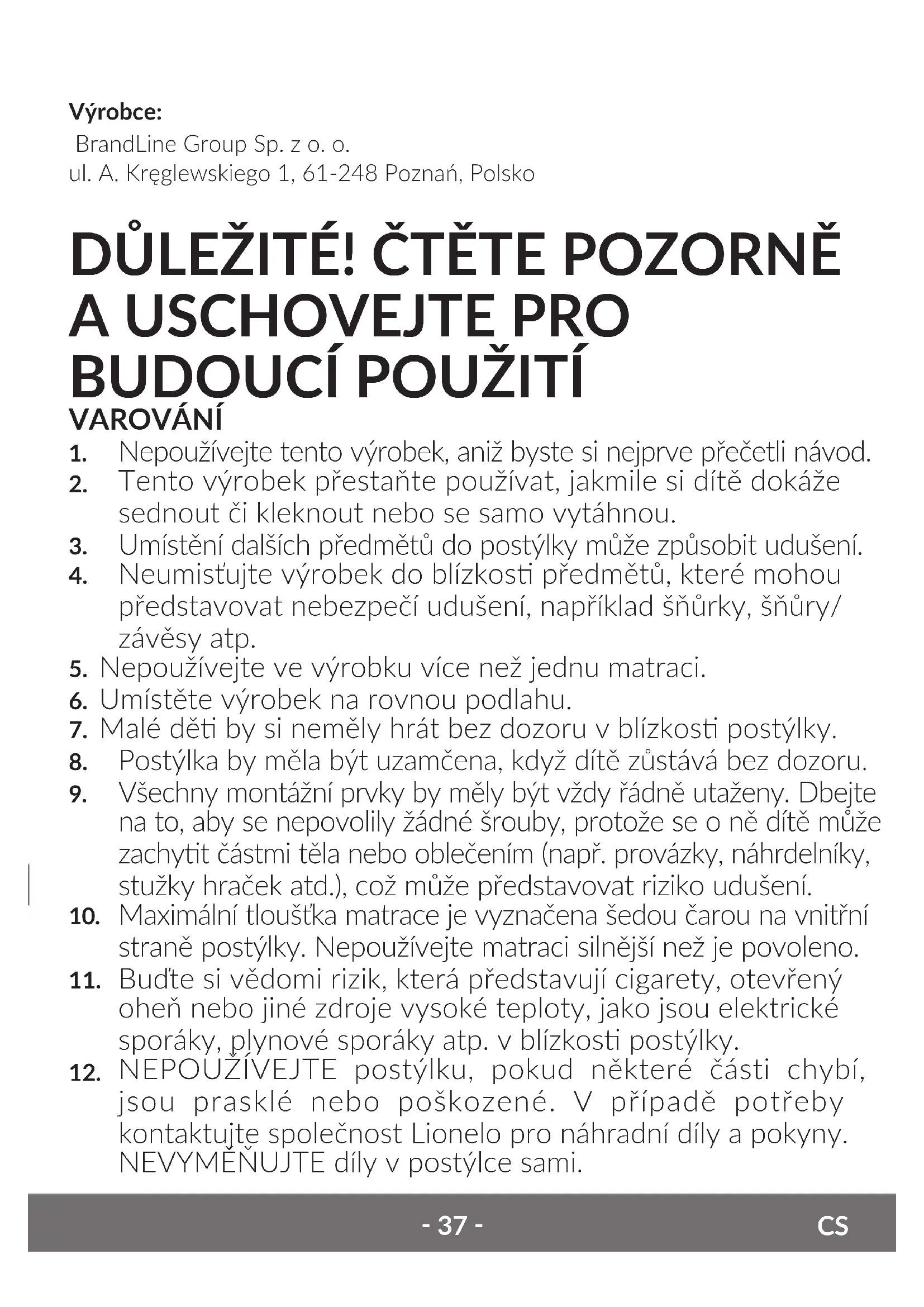 NEPOUŽÍVEJTE postýlku, pokud některé části chybí, jsou prasklé nebo poškozené. V případě potřeby kontaktujte společnost Lionelo pro náhradní díly a pokyny. NEVYMĚŇUJTE díly v postýlce sami.‑ 38 ‑