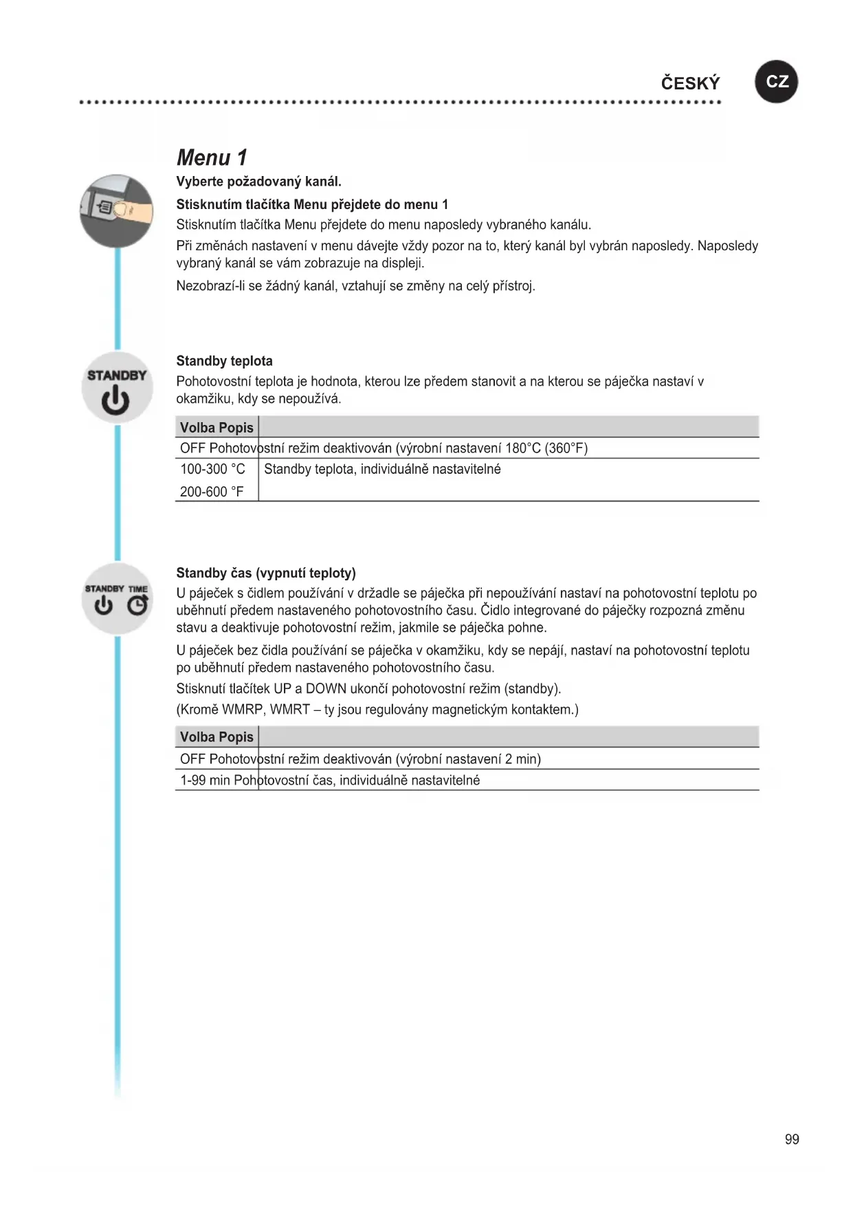 - Arabirim ayarlarını kontrol edin99 Menu 1 Vyberte požadovaný kanál. Stisknutm tlačtka Menu přejdete do menu 1 Stisknutím tlačítka Menu přejdete do menu naposledy vybraného kanálu. Při změnách nastavení v menu dávejte vždy pozor na to, který kanál byl vybrán naposledy. Naposledy vybraný kanál se vám zobrazuje na displeji. Nezobrazí-li se žádný kanál, vztahují se změny na celý přístroj. Standby teplota Pohotovostní teplota je hodnota, kterou lze předem stanovit a na kterou se páječka nastaví v okamžiku, kdy se nepoužívá. Volba Popis OFF Pohotovostní režim deaktivován (výrobní nastavení 180°C (360°F) 100-300 °C 200-600 °F Standby teplota, individuálně nastavitelné Standby čas (vypnut teploty) U páječek s čidlem používání v držadle se páječka při nepoužívání nastaví na pohotovostní teplotu po uběhnutí předem nastaveného pohotovostního času. Čidlo integrované do páječky rozpozná změnu stavu a deaktivuje pohotovostní režim, jakmile se páječka pohne. U páječek bez čidla používání se páječka v okamžiku, kdy se nepájí, nastaví na pohotovostní teplotu po uběhnutí předem nastaveného pohotovostního času. Stisknutí tlačítek UP a DOWN ukončí pohotovostní režim (standby). (Kromě WMRP, WMRT – ty jsou regulovány magnetickým kontaktem.) Volba Popis OFF Pohotovostní režim deaktivován (výrobní nastavení 2 min) 1-99 min Pohotovostní čas, individuálně nastavitelné