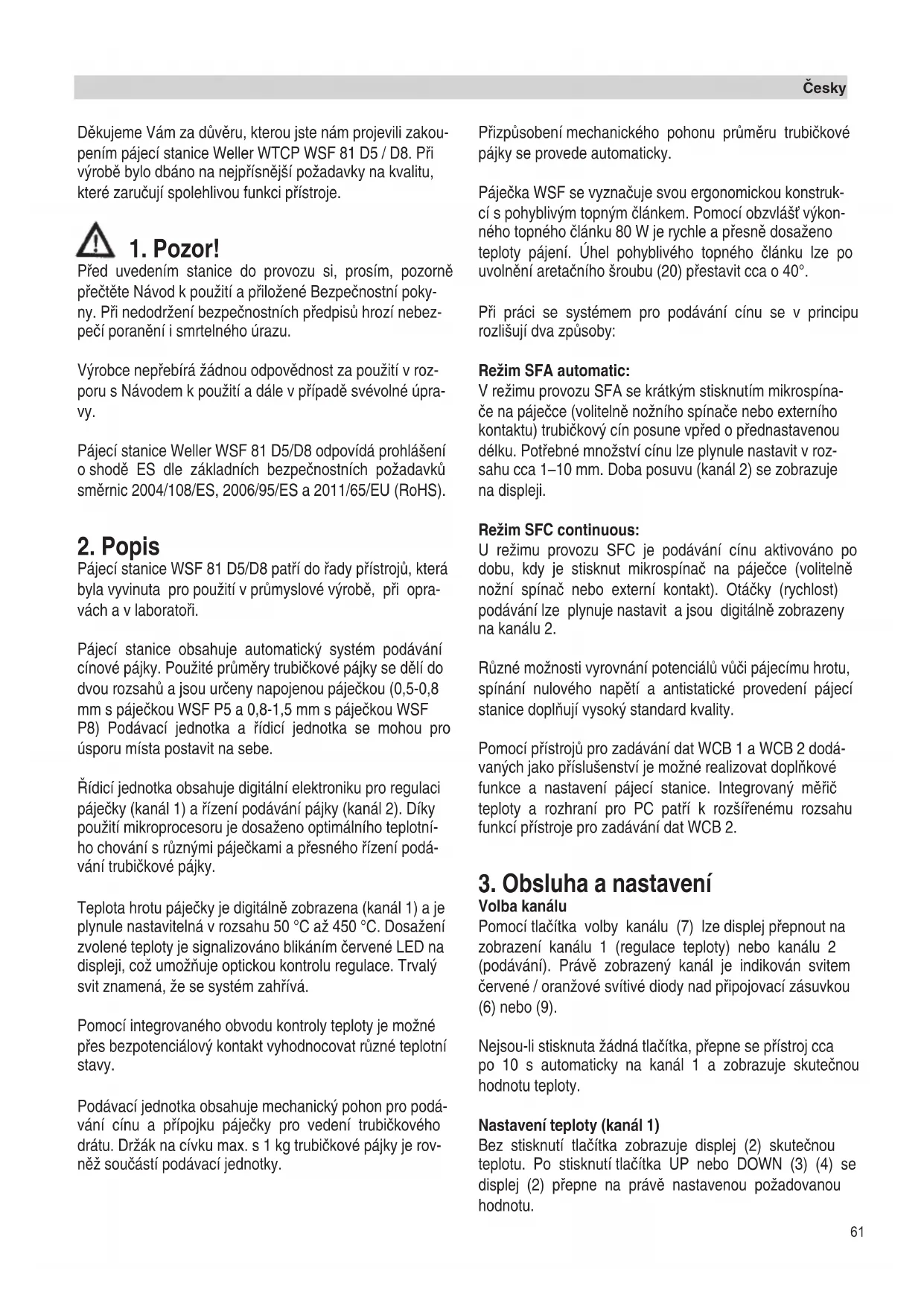 Pfied uvedením stanice do provozu si, prosím, pozornû pfieãtûte Návod k pouÏití a pfiiloÏené Bezpeãnostní poky- ny. Pfii nedodrÏení bezpeãnostních pfiedpisÛ hrozí nebez- peãí poranûní i smrtelného úrazu. V˘robce nepfiebírá Ïádnou odpovûdnost za pouÏití v roz- poru s Návodem k pouÏití a dále v pfiípadû svévolné úpra- vy. Pájecí stanice Weller WSF 81 D5/D8 odpovídá prohlá‰ení o shodû ES dle základních bezpeãnostních poÏadavkÛ smûrnic 2004/108/ES, 2006/95/ES a 2011/65/EU (RoHS).