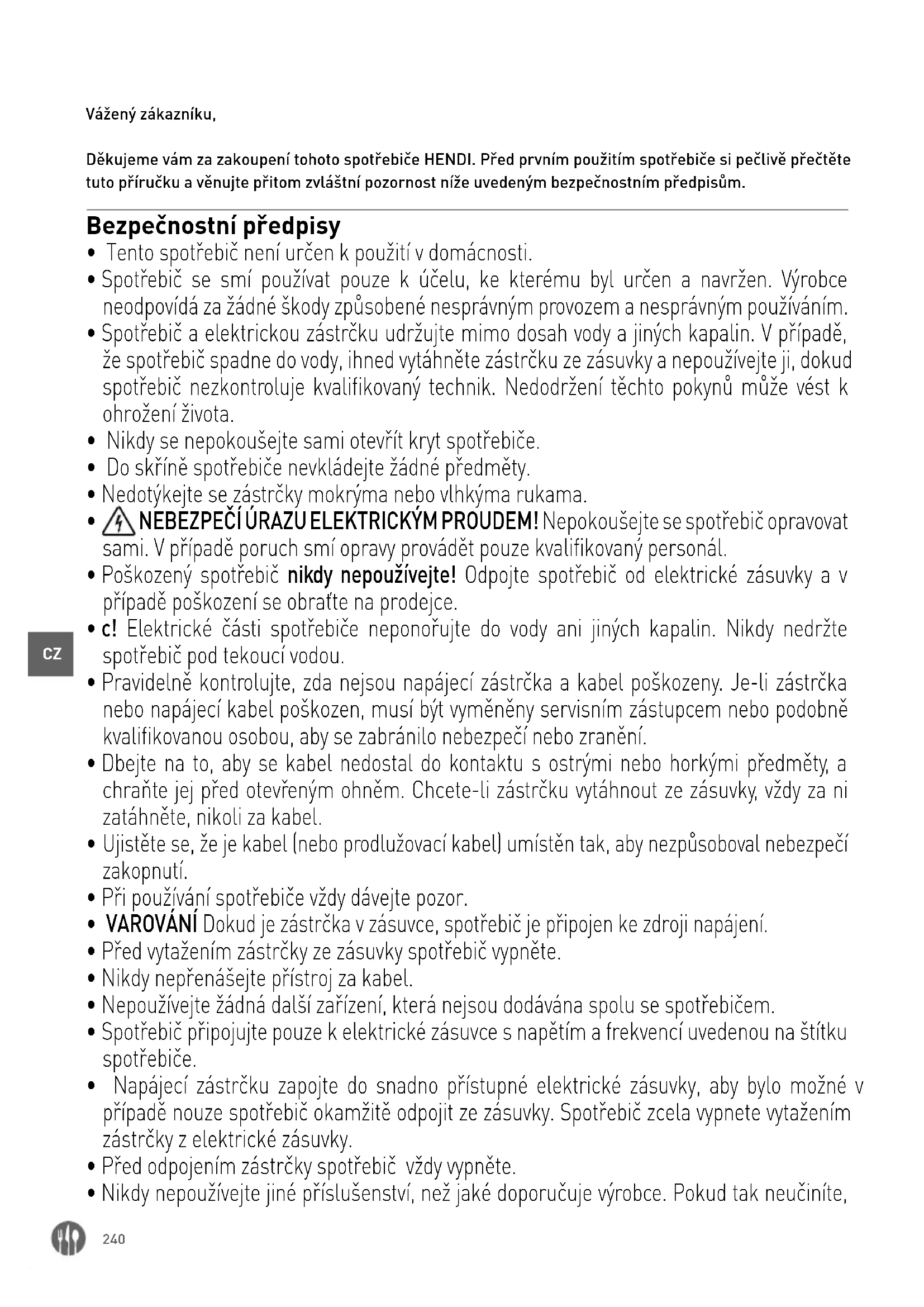 Vážený zákazníku, Děkujeme vám za zakoupení tohoto spotřebiče HENDI. Před prvním použitím spotřebiče si pečlivě přečtěte tuto příručku a věnujte přitom zvláštní pozornost níže uvedeným bezpečnostním předpisům. Bezpečnostní předpisy