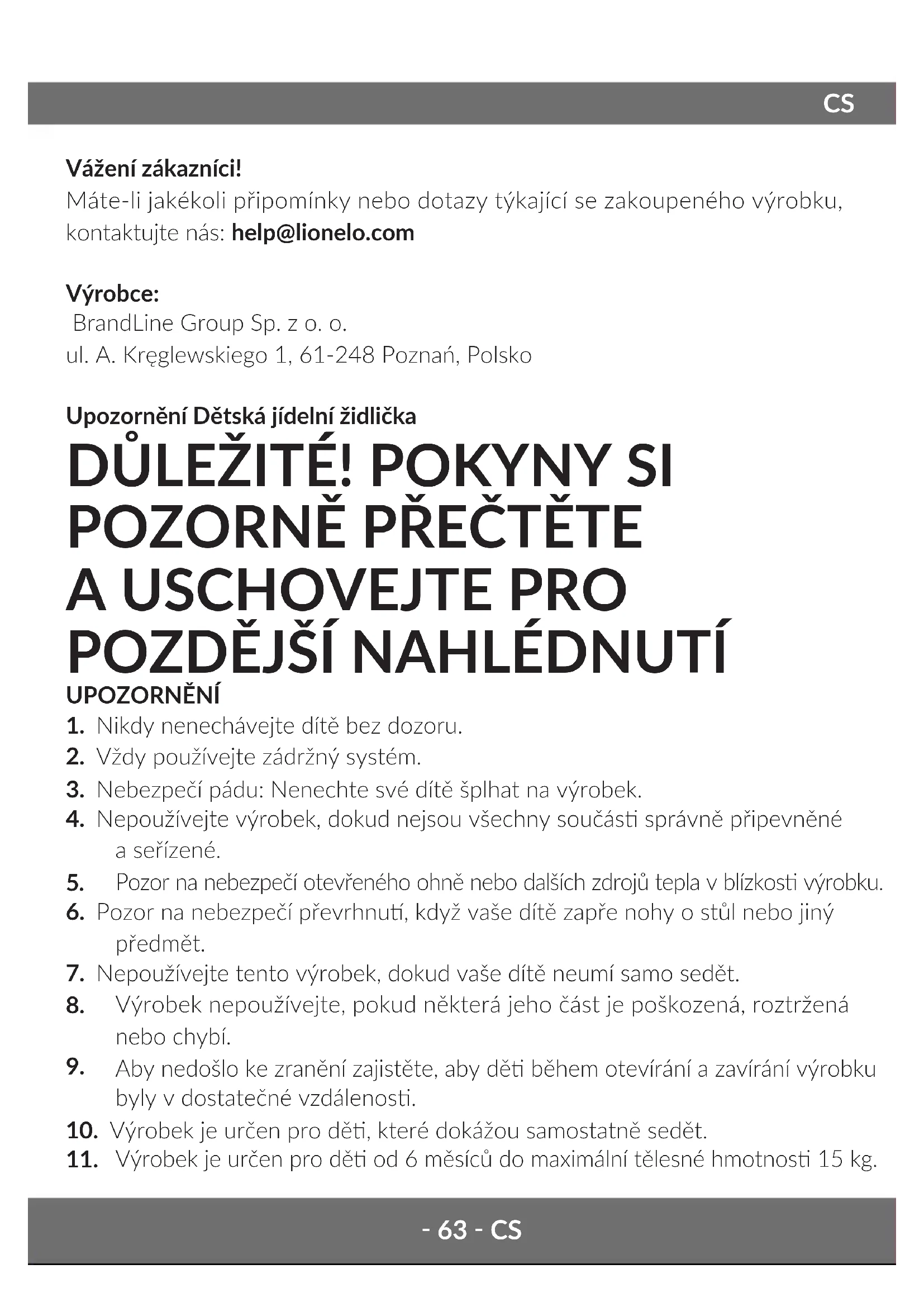 Iliustracijos skirtos k informaciniams kslams. Reali prekių išvaizda gali skirs nuo pavaizduotos nuotraukose.‑ 63 ‑ CS Vážení zákazníci! Máte-li jakékoli připomínky nebo dotazy týkající se zakoupeného výrobku, kontaktujte nás: help@lionelo.com Výrobce: BrandLine Group Sp. z o. o. ul. A. Kręglewskiego 1, 61-248 Poznań, Polsko Upozornění Dětská jídelní židlička