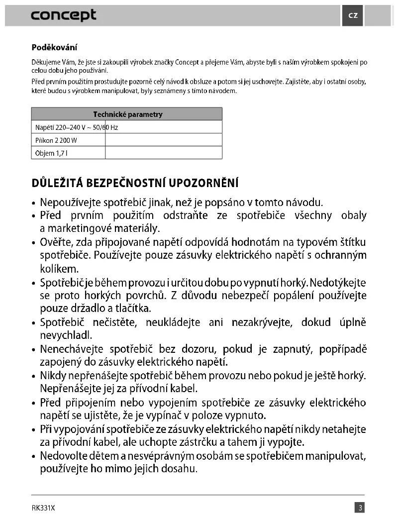 Poděkování Děkujeme Vám, že jste si zakoupili výrobek značky Concept a přejeme Vám, abyste byli s naším výrobkem spokojeni po celou dobu jeho používání. Před prvním použitím prostudujte pozorně celý návod k obsluze a potom si jej uschovejte. Zajistěte, aby i ostatní osoby, které budou s výrobkem manipulovat, byly seznámeny s tímto návodem. Technické parametry Napětí 220–240 V ~ 50/60 Hz Příkon 2 200 W Objem 1,7 l DŮLEŽITÁ BEZPEČNOSTNÍ UPOZORNĚNÍ