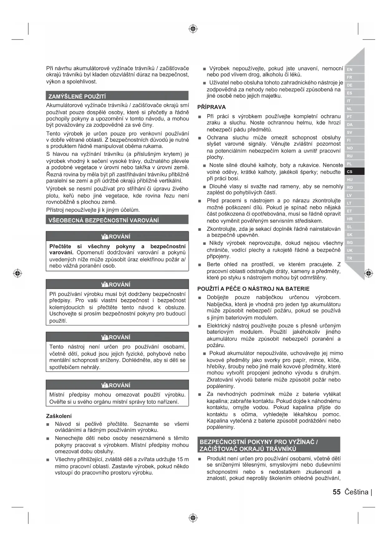Akumulátorové vyžínače trávníků / začišťovače okrajů smí používat pouze dospělé osoby, které si přečetly a řádně pochopily pokyny a upozornění v tomto návodu, a mohou být považovány za zodpovědné za své činy. Tento výrobek je určen pouze pro venkovní používání v dobře větrané oblasti. Z bezpečnostních důvodů je nutné s produktem řádně manipulovat oběma rukama. S hlavou na vyžínání trávníku (a příslušným krytem) je výrobek vhodný k sečení vysoké trávy, dužnatého plevele a podobné vegetace v úrovni nebo takřka v úrovni země. Řezná rovina by měla být při zastřihávání trávníku přibližně paralelní se zemí a při údržbě okrajů přibližně vertikální. Výrobek se nesmí používat pro stříhání či úpravu živého plotu, keřů nebo jiné vegetace, kde rovina řezu není rovnoběžně s plochou země. Přístroj nepoužívejte ji k jiným účelům.