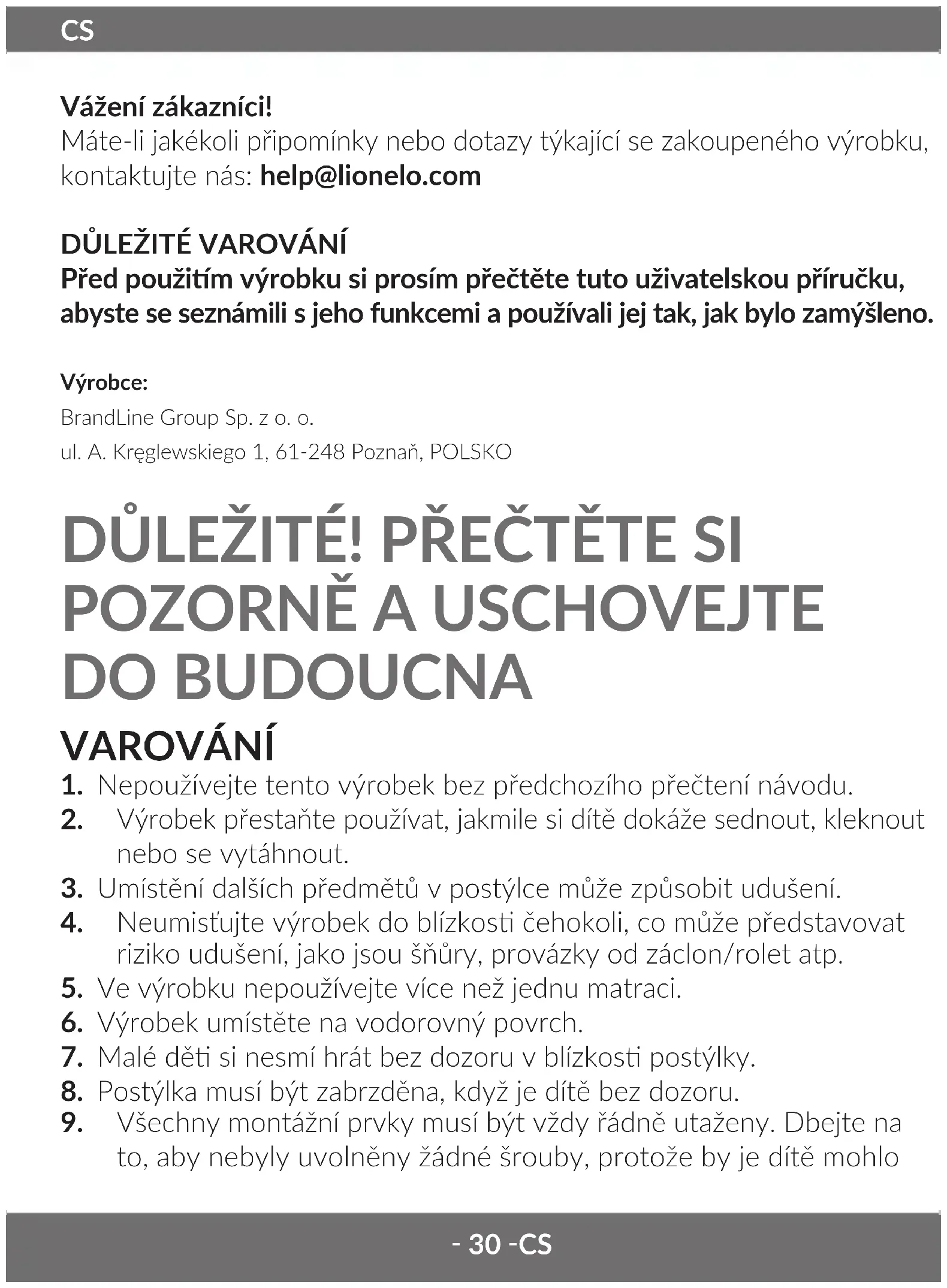 nebo poškozené. Bude-li třeba, kontaktujte Lionelo ohledně náhradních dílů a pokynů. NEMĚŇTE součás výrobku sami. VAROVÁNÍ pro matraci: