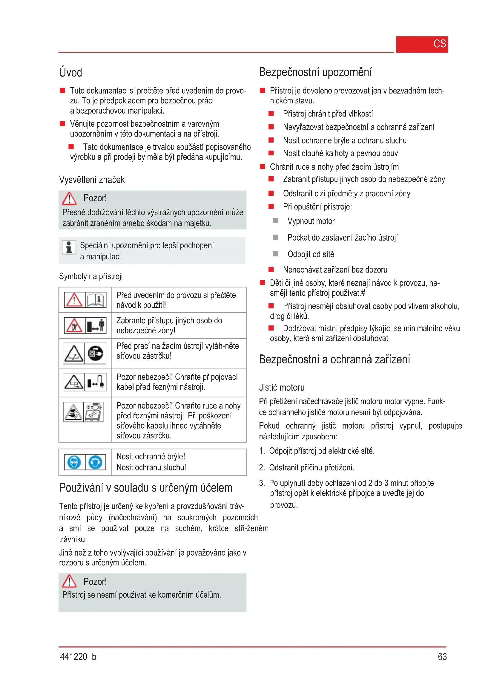 Úvod Tutodokumentacisipročtětepředuvedenímdoprovo- zu.Tojepředpoklademprobezpečnoupráci abezporuchovoumanipulaci. Věnujtepozornostbezpečnostnímavarovným upozorněnímvtétodokumentacianapřístroji. Tatodokumentacejetrvalousoučástípopisovaného výrobkuapřiprodejibymělabýtpředánakupujícímu. Vysvětleníznaček Pozor! Přesnédodržovánítěchtovýstražnýchupozorněnímůže zabránitzraněníma/neboškodámnamajetku. Speciálníupozorněníprolepšípochopení amanipulaci. Symbolynapřístroji Předuvedenímdoprovozusipřečtěte návodkpoužití! Zabraňtepřístupujinýchosobdo nebezpečnézóny! Předpracínažacímústrojívytáh-něte síťovouzástrčku! Pozornebezpečí!Chraňtepřipojovací kabelpředřeznýminástroji. Pozornebezpečí!Chraňteruceanohy předřeznýminástroji.Připoškození síťovéhokabeluihnedvytáhněte síťovouzástrčku. Nositochrannébrýle! Nosit ochranu sluchu! Používánívsouladusurčenýmúčelem Tentopřístrojjeurčenýkekypřeníaprovzdušňovánítráv- níkové půdy (načechrávání) na soukromých pozemcích a smí se používat pouze na suchém, krátce stři-ženém trávníku. Jinénežztohovyplývajícípoužíváníjepovažovánojakov rozporusurčenýmúčelem. Pozor! Přístrojsenesmípoužívatkekomerčnímúčelům. Bezpečnostníupozornění Přístrojjedovolenoprovozovatjenvbezvadnémtech- nickémstavu. Přístrojchránitpředvlhkostí Nevyřazovatbezpečnostníaochrannázařízení Nositochrannébrýleaochranusluchu Nosit dlouhé kalhoty a pevnou obuv Chránit ruce a nohy předžacímústrojím Zabránitpřístupujinýchosobdonebezpečnézóny Odstranitcizípředmětyzpracovnízóny Přiopuštěnípřístroje: Vypnoutmotor Počkatdozastavenížacíhoústrojí Odpojitodsítě Nenechávatzařízeníbezdozoru Dětičijinéosoby,kteréneznajínávodkprovozu,ne- smějítentopřístrojpoužívat.# Přístrojnesmějíobsluhovatosobypodvlivemalkoholu, drogčiléků. Dodržovatmístnípředpisytýkajícíseminimálníhověku osoby,kterásmízařízeníobsluhovat Bezpečnostníaochrannázařízení Jističmotoru Připřetíženínačechrávačejističmotorumotorvypne.Funk- ceochrannéhojističemotorunesmíbýtodpojována. Pokud ochranný jistič motoru přístroj vypnul, postupujte následujícímzpůsobem: