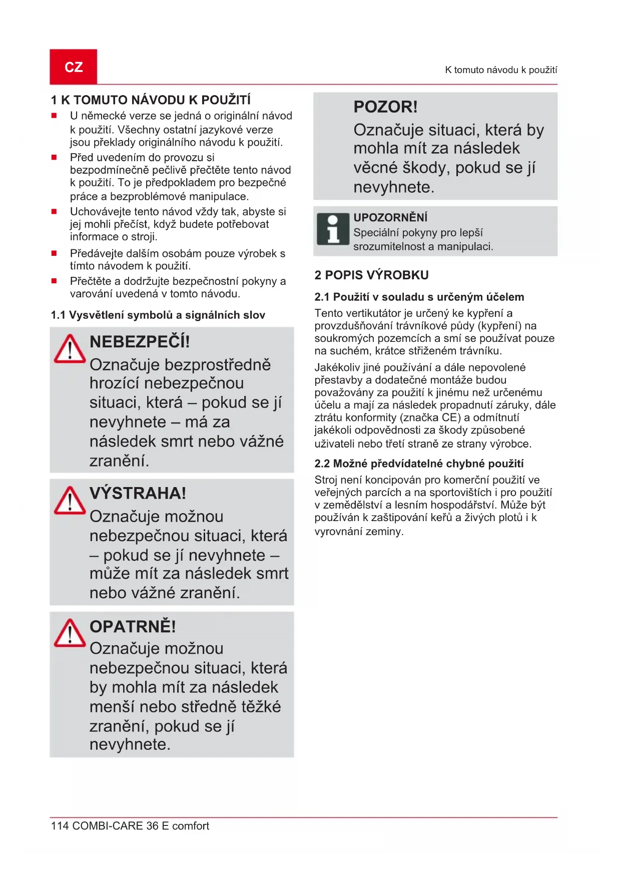 Význam Před uvedením do provozu si přečtěte návod k použití! Třetí osoby držte stranou nebezpečné oblasti! Dodržujte bezpečnostní vzdálenost! Nohy a ruce udržujte dál od řezného ústrojí! Před údržbou, ošetřováním i čištěním odpojte stroj ze sítě! Elektrický kabel nesmí být přejížděn! Nebezpečí úrazu elektrickým proudem u poškozeného síťového kabelu. Noste ochranu sluchu a očí. Síťový kabel odpojte od sítě, jestliže se zamotal nebo byl poškozen. Postup k nastartování motoru (viz Kapitola 6.5 "Nastartování a zastavení motoru(09)", strana120) Zaručená hladina akustického výkonu LwACZ 116 COMBI-CARE 36 E comfort Bezpečnostní pokyny